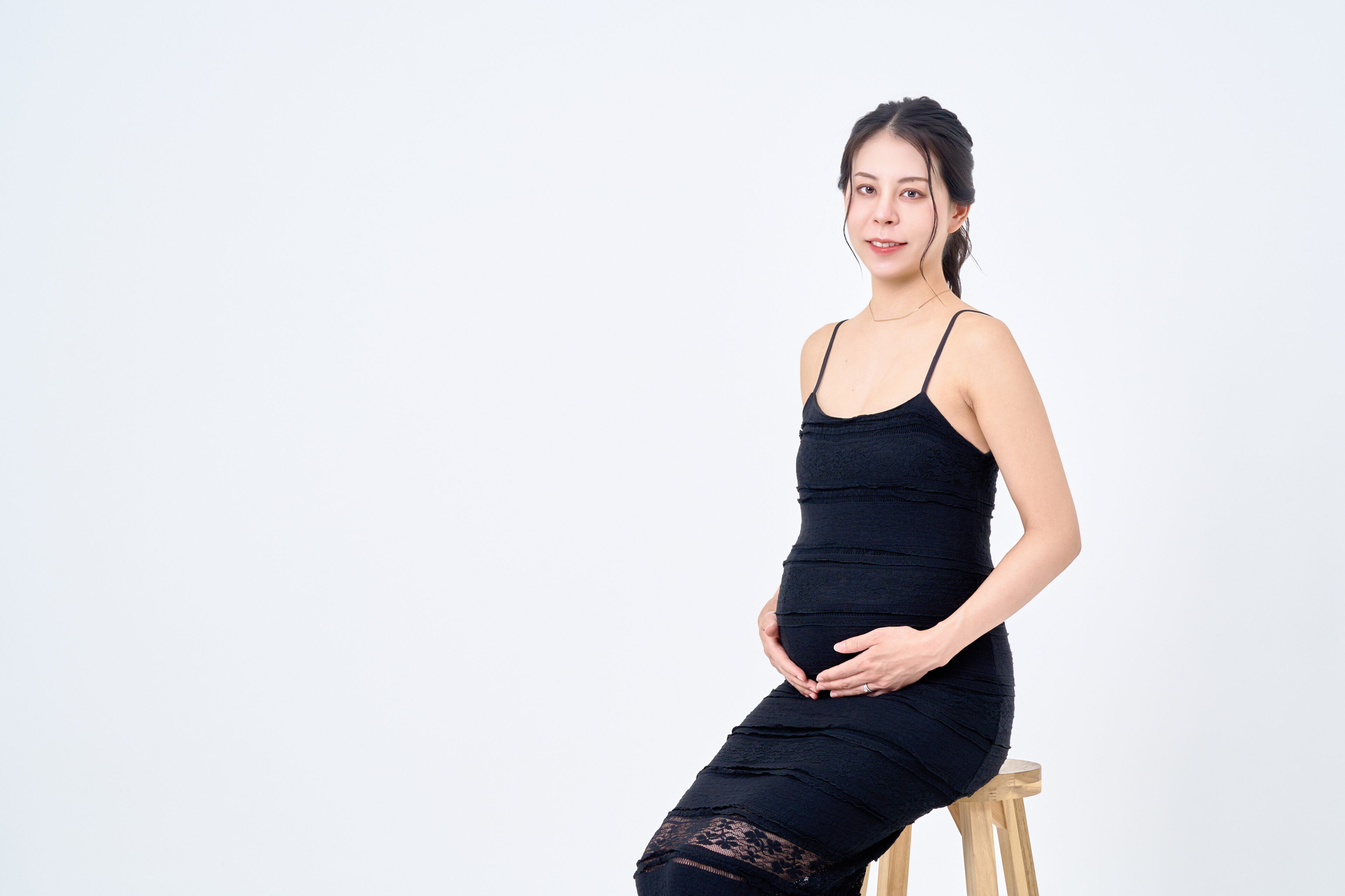 マタニティフォトの撮影です。白背景と明るいライティングで、シンプルながらもタイムレスな一枚に仕上げました。