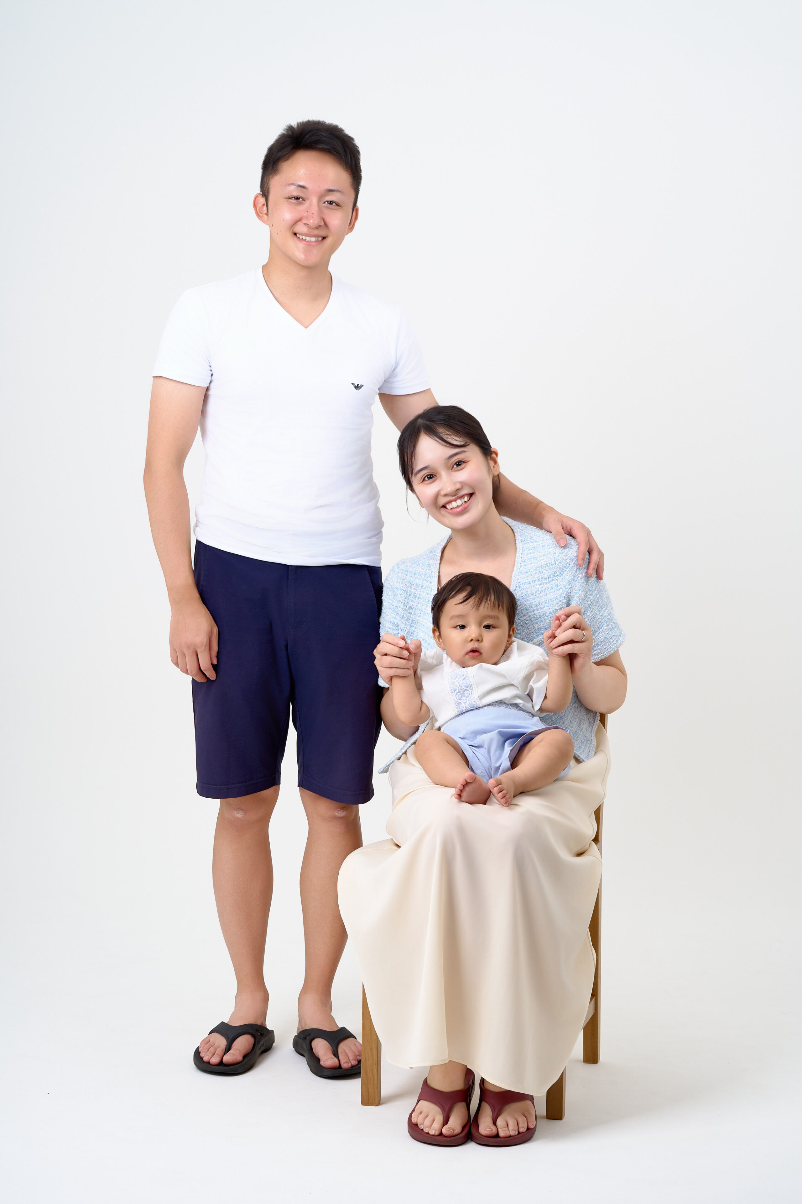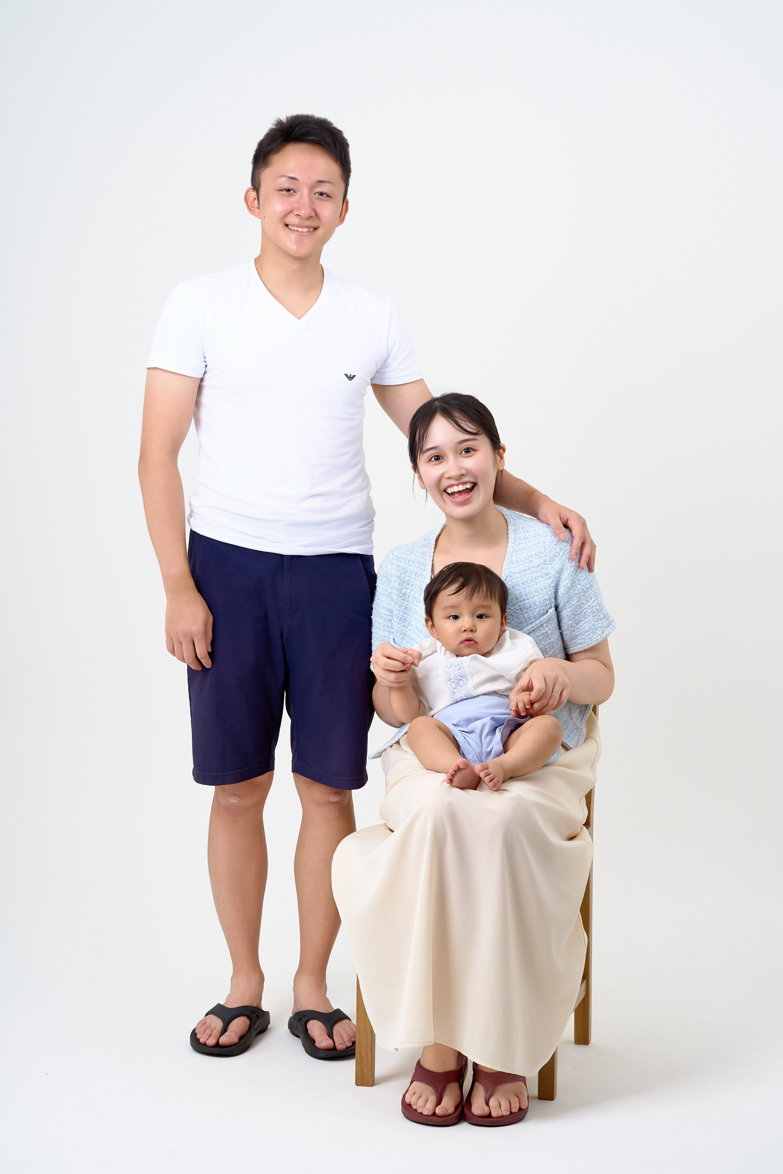 家族写真の撮影です。白背景で明るいライティングに包まれる中、自然な笑顔とリラックスした表情を引き出すため、和やかな空間を作り、ご家族の「今」を等身大に残します。