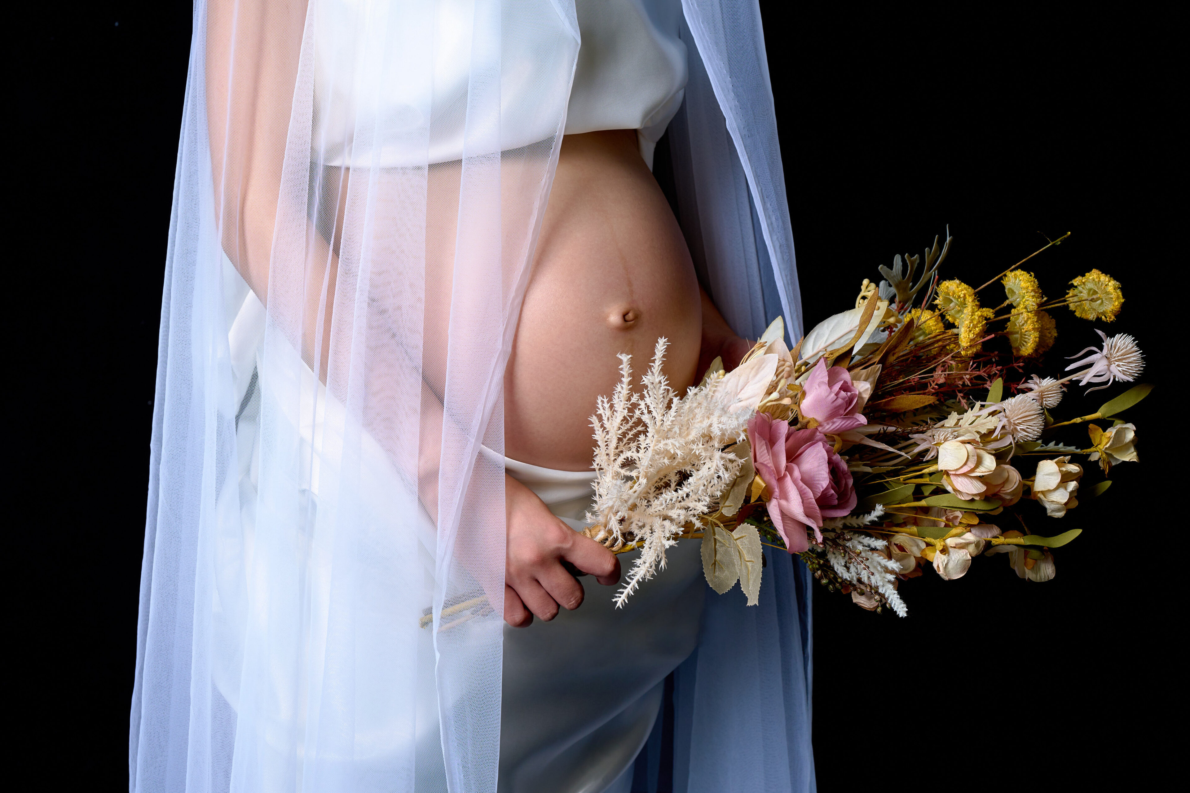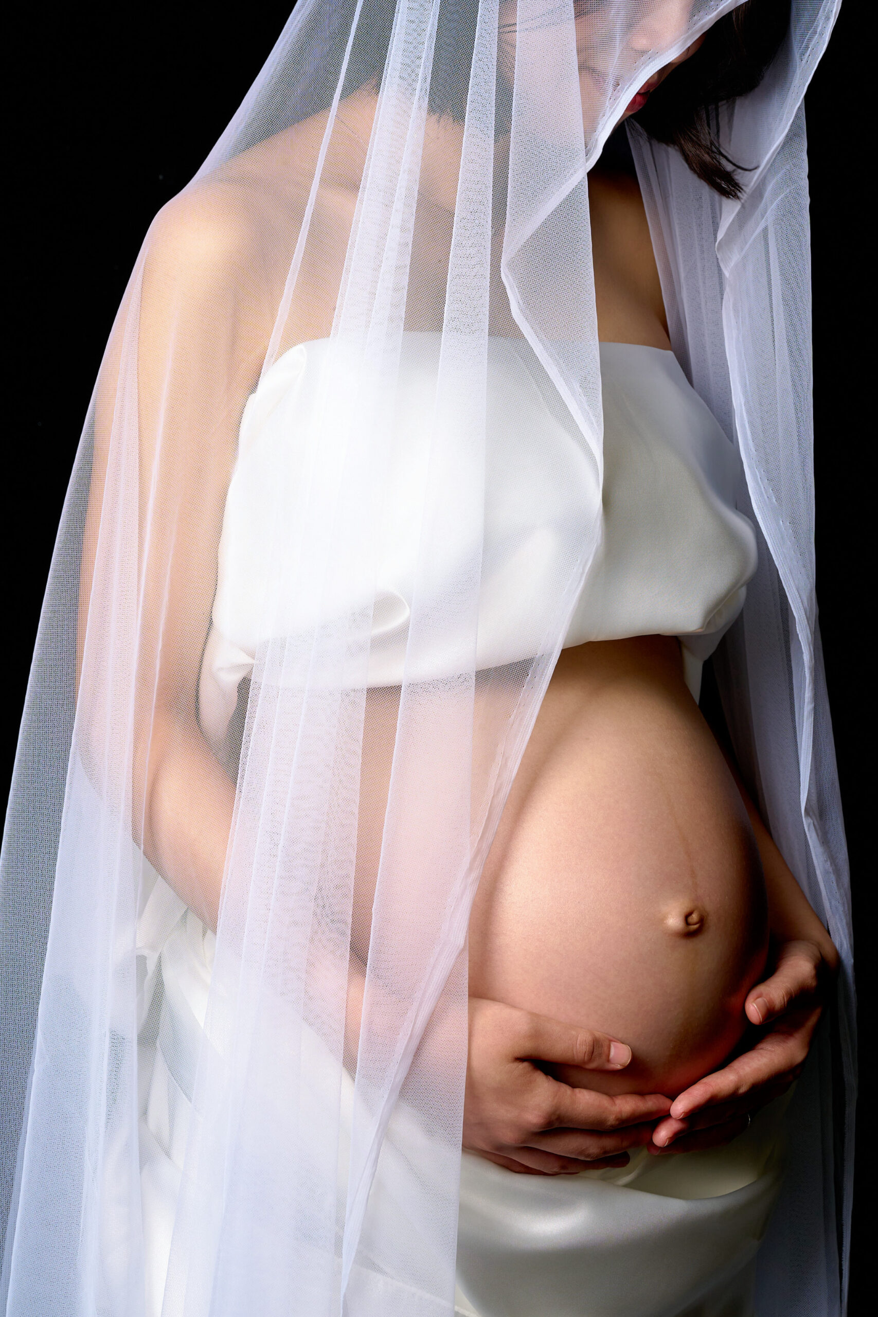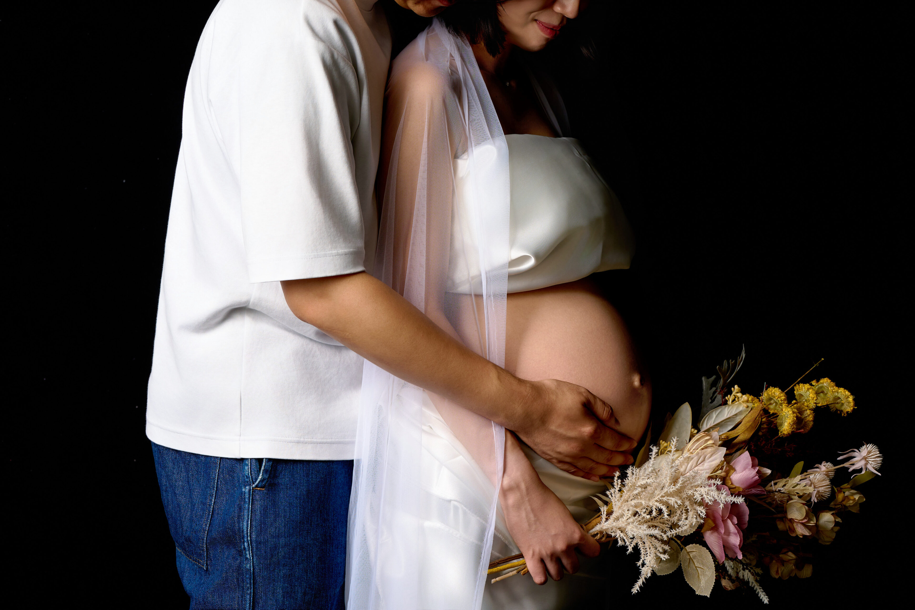 マタニティフォトの撮影です。余計な装飾をなくした黒背景で、シックな雰囲気を作り、印象的に魅せます。