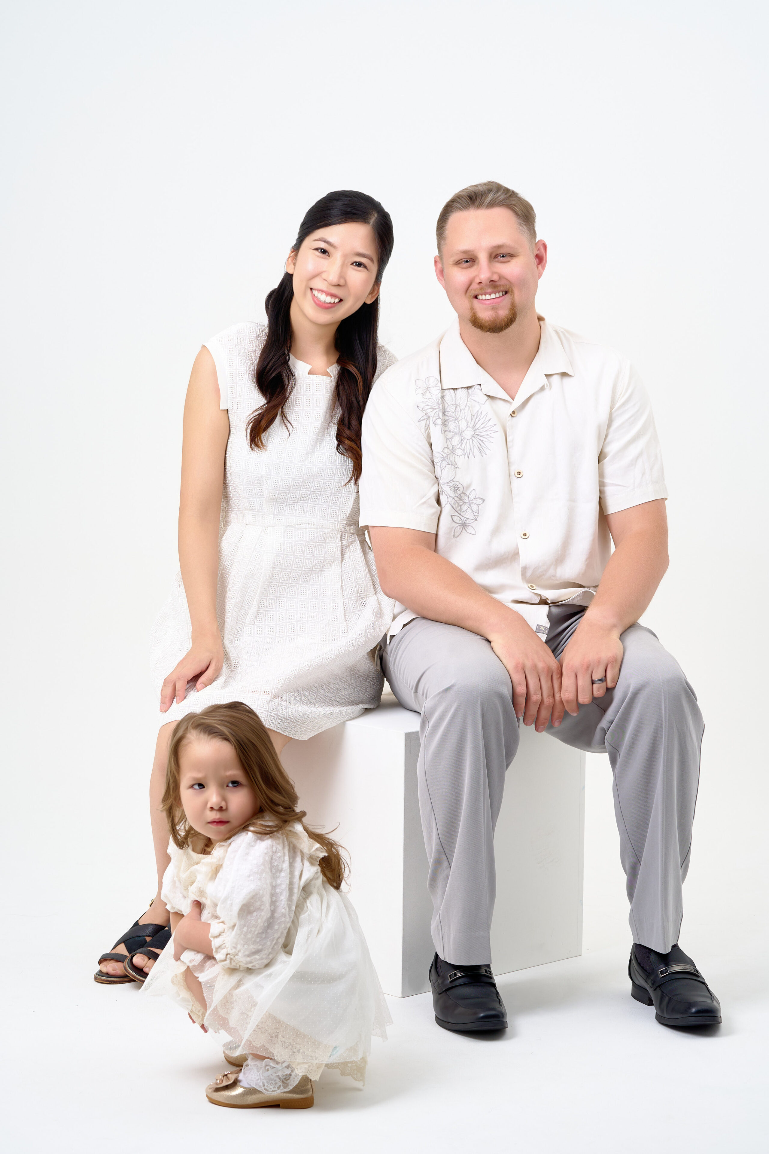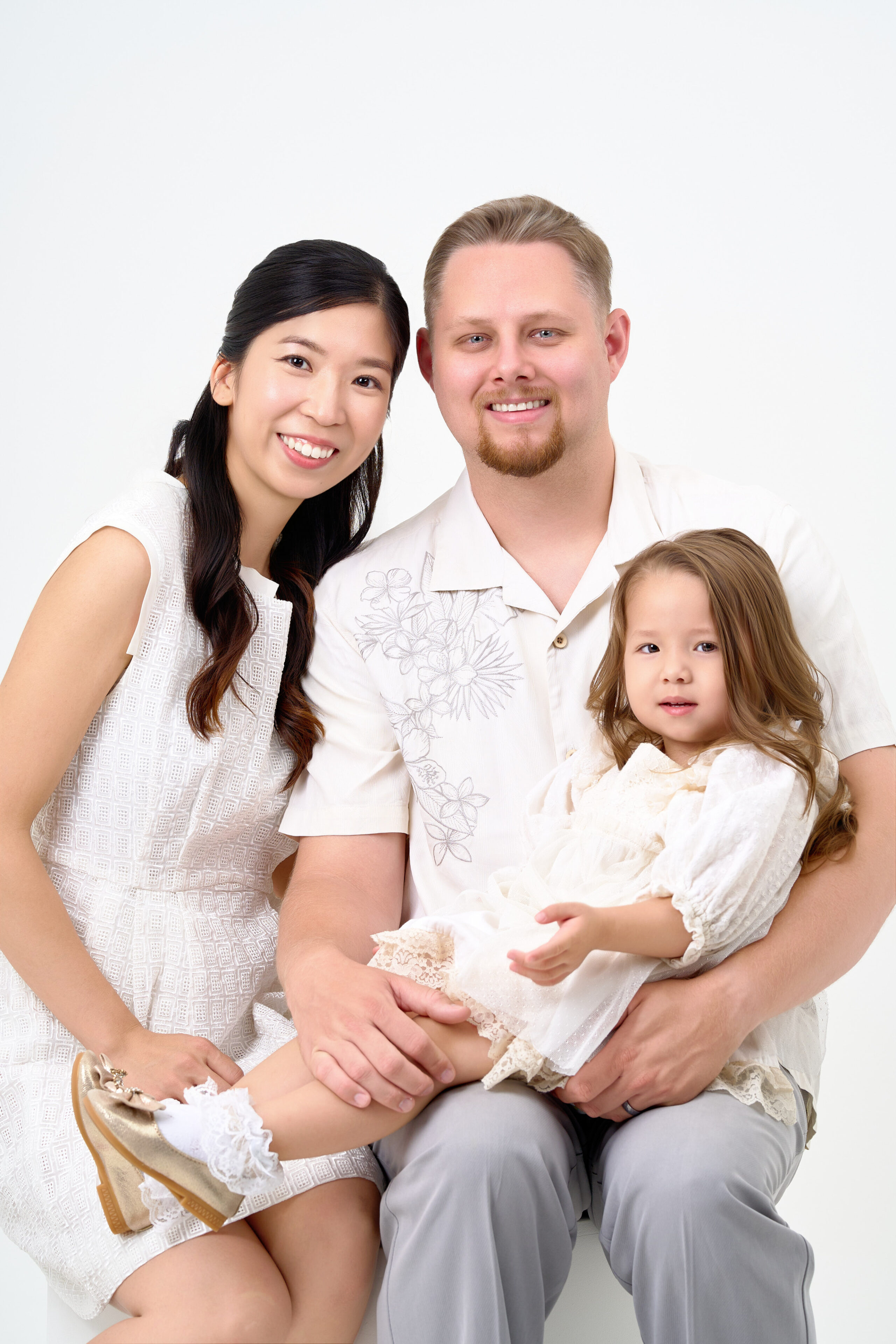 家族写真の撮影です。白背景とこだわりの柔らかいライティングにおそろいの白コーデで、ご家族の表情やしぐさを引き立て、シンプルで洗練された印象に。