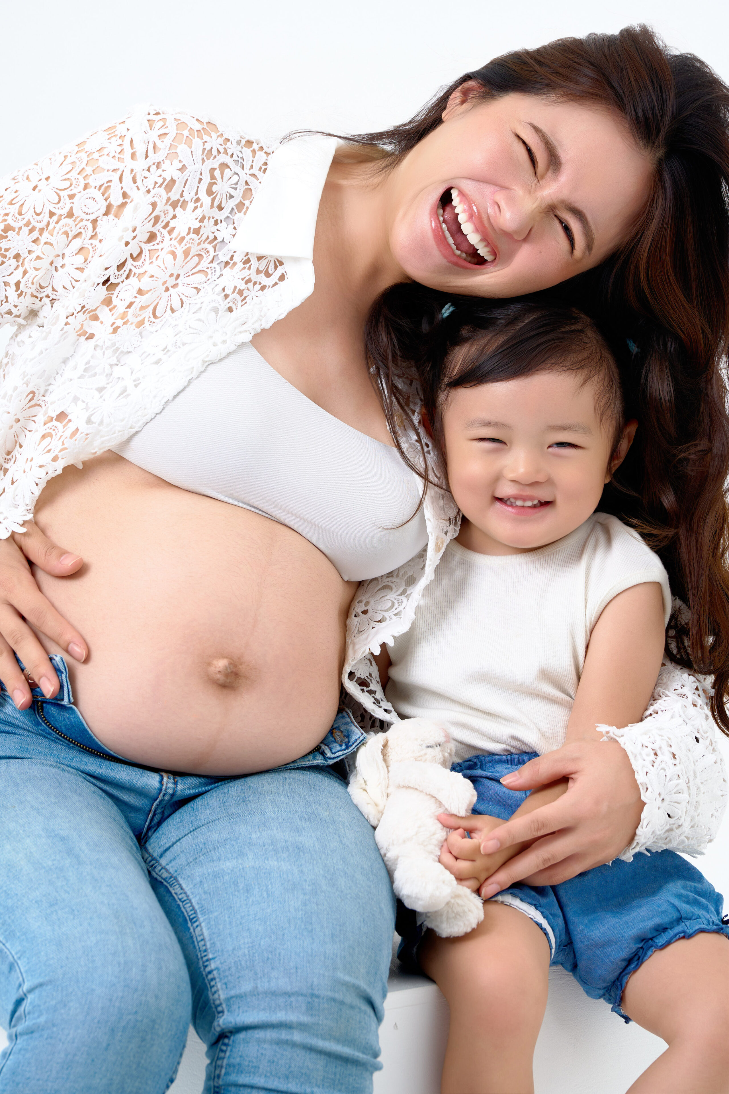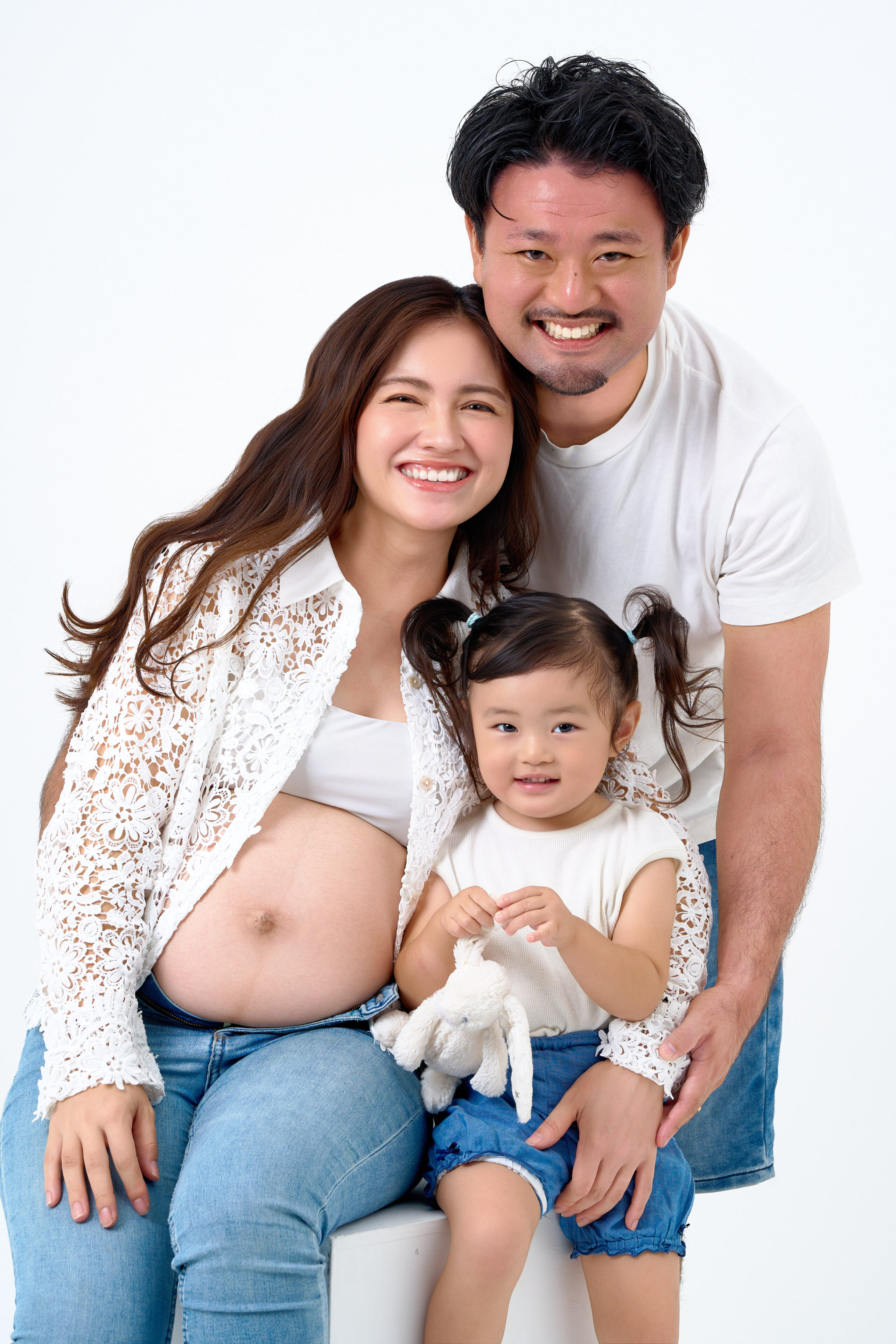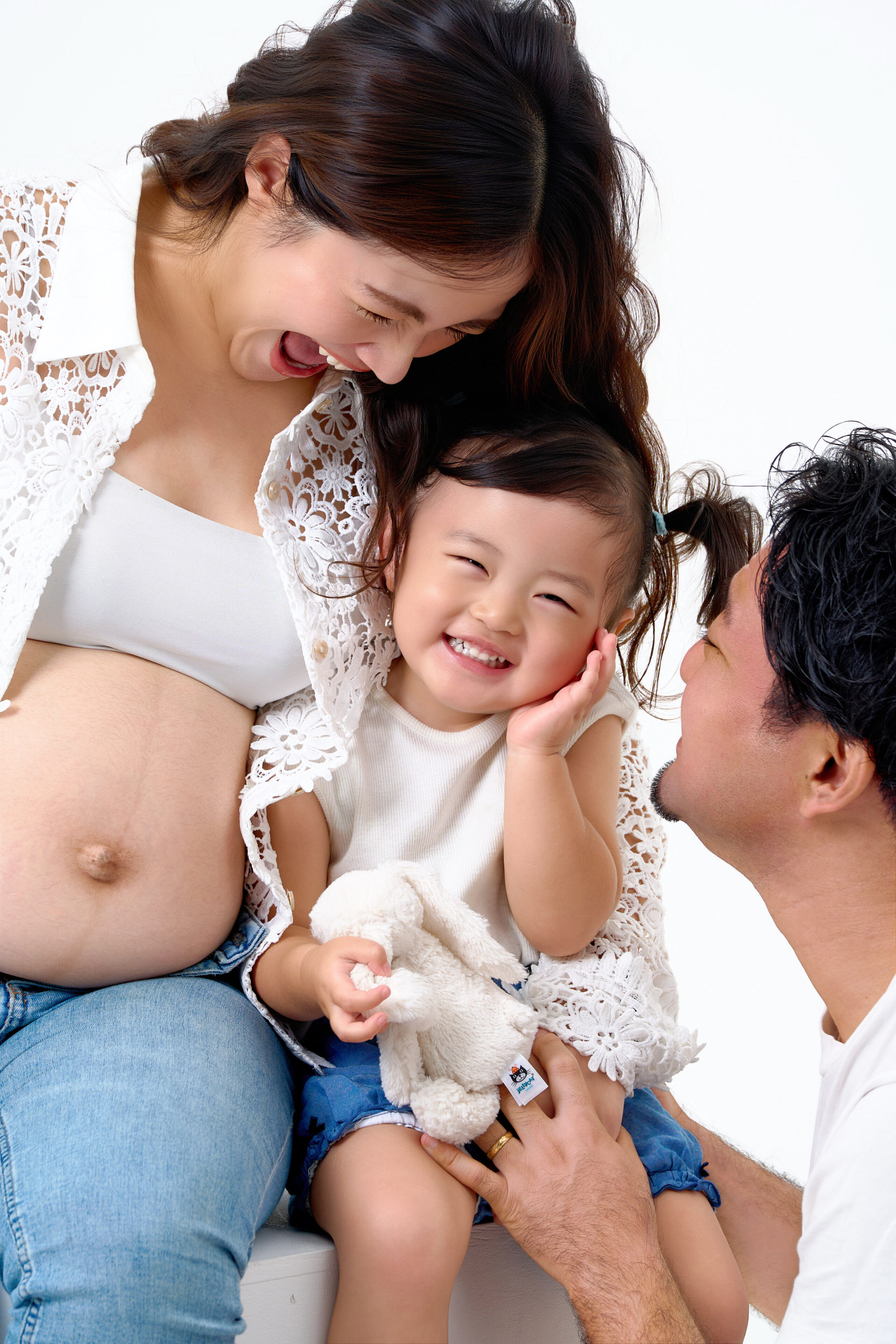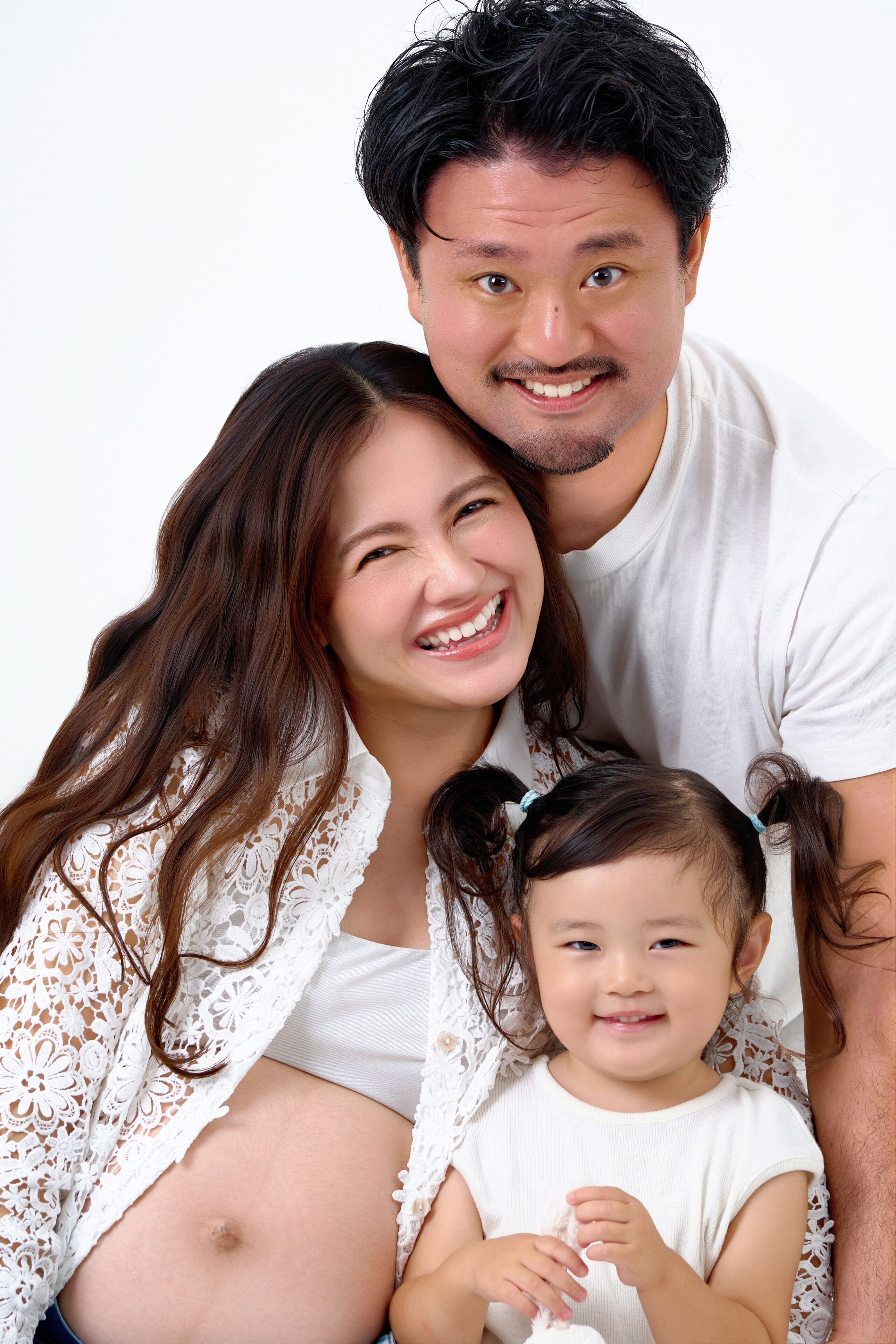 マタニティフォトの撮影です。白背景を活かしたフレッシュで定番なライティングを使用し、ご夫婦の優しい表情やお子様の無邪気な笑顔、「家族の今」を物語る瞬間をかけがえのない思い出に。新しい命を迎える喜びと温もりを自然体のまま写真に残します。