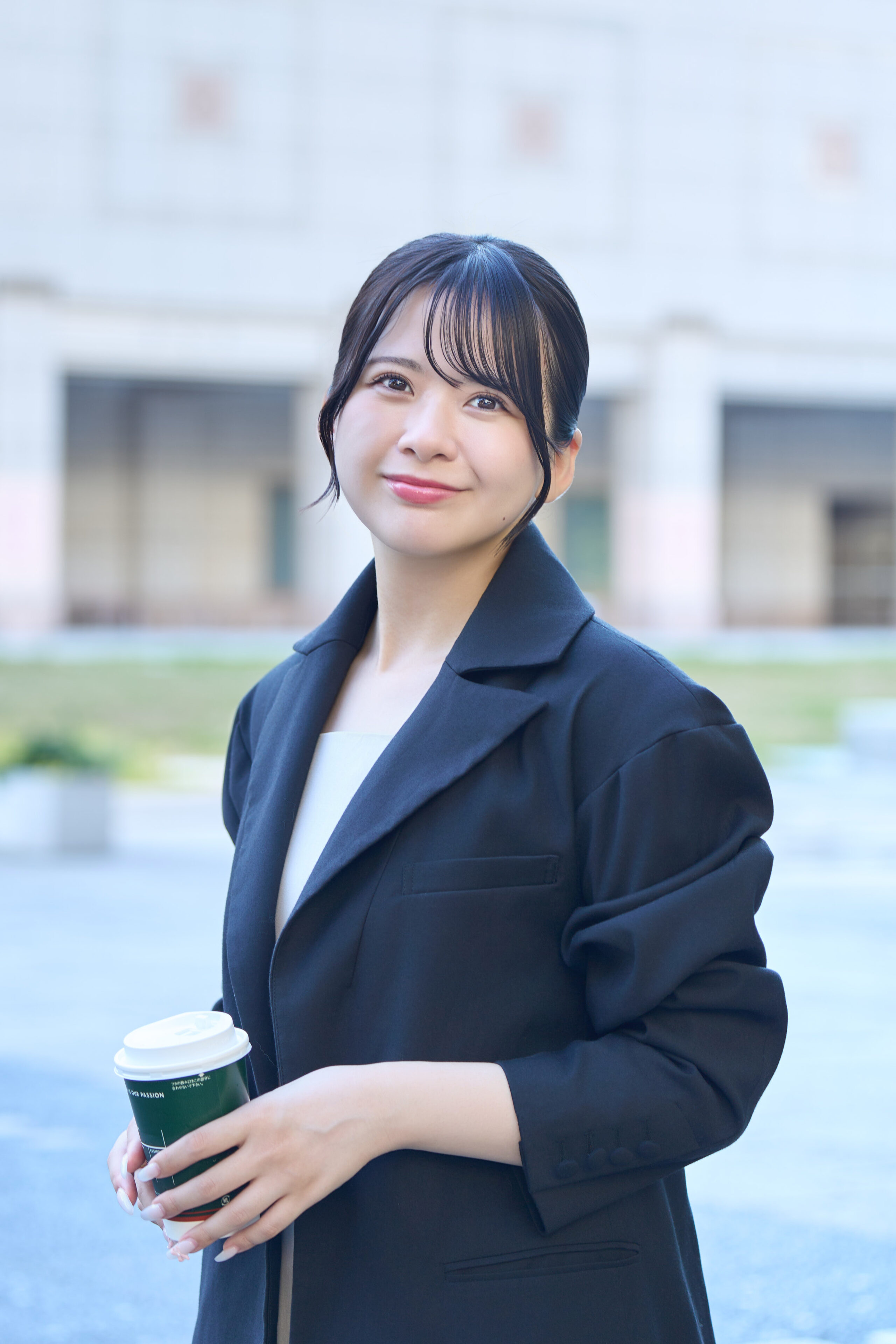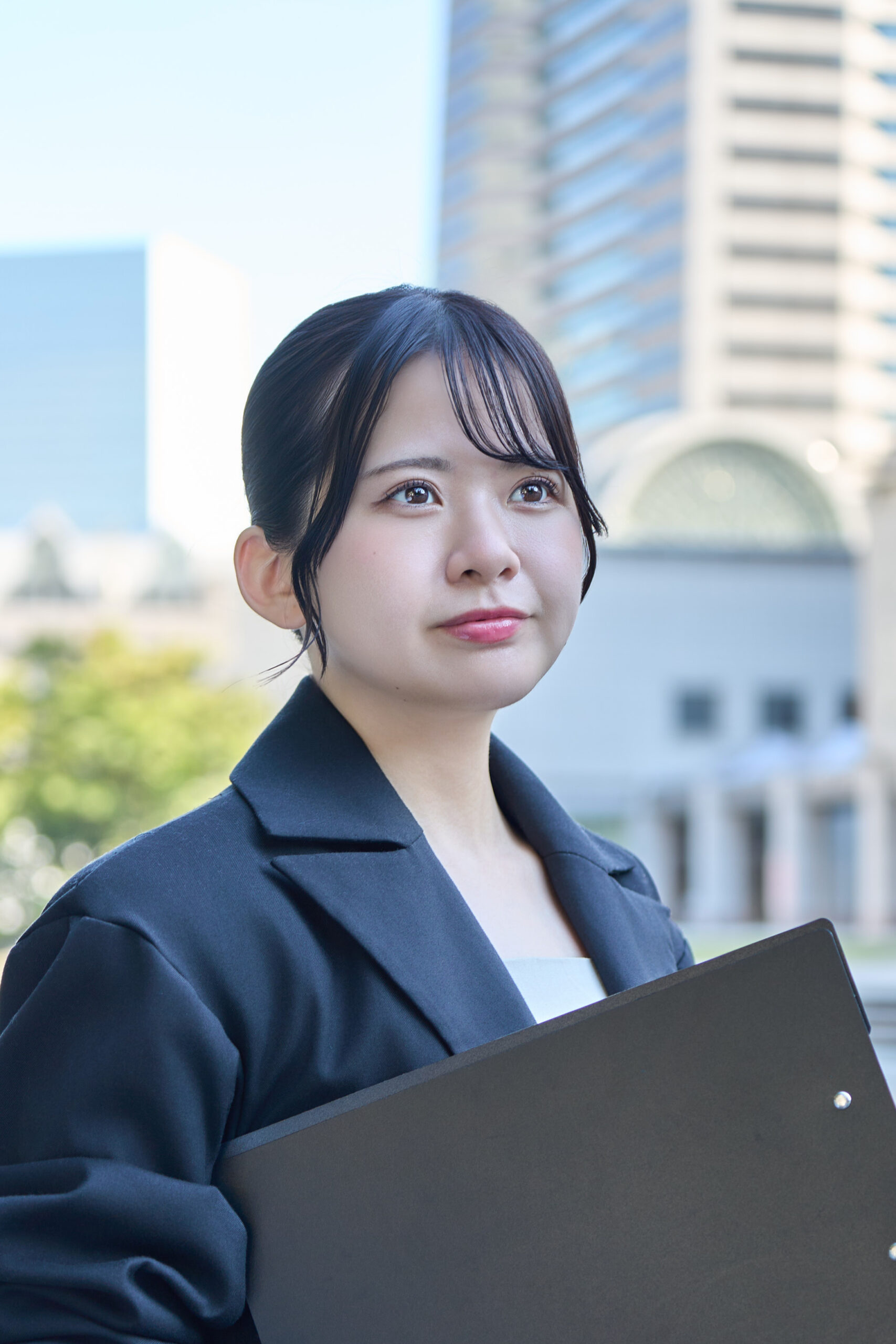 宣材写真のロケーション撮影です。ビジネス系の宣材写真にぴったりな都会を感じさせるロケーションが、清潔感と親しみやすさを自然に演出します。背景に柔らかなボケ感が生まれることで、好印象で信頼感のある1枚に。