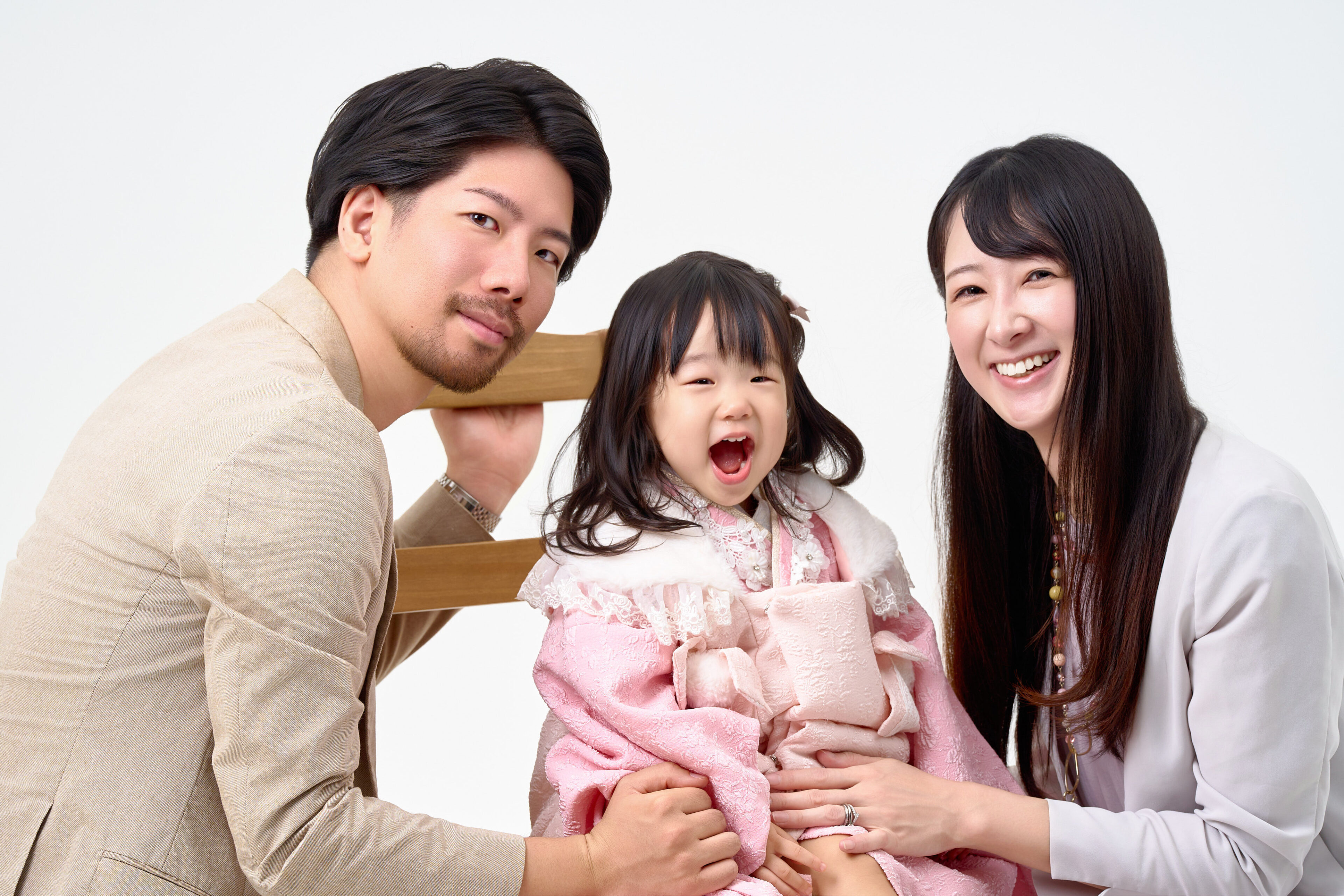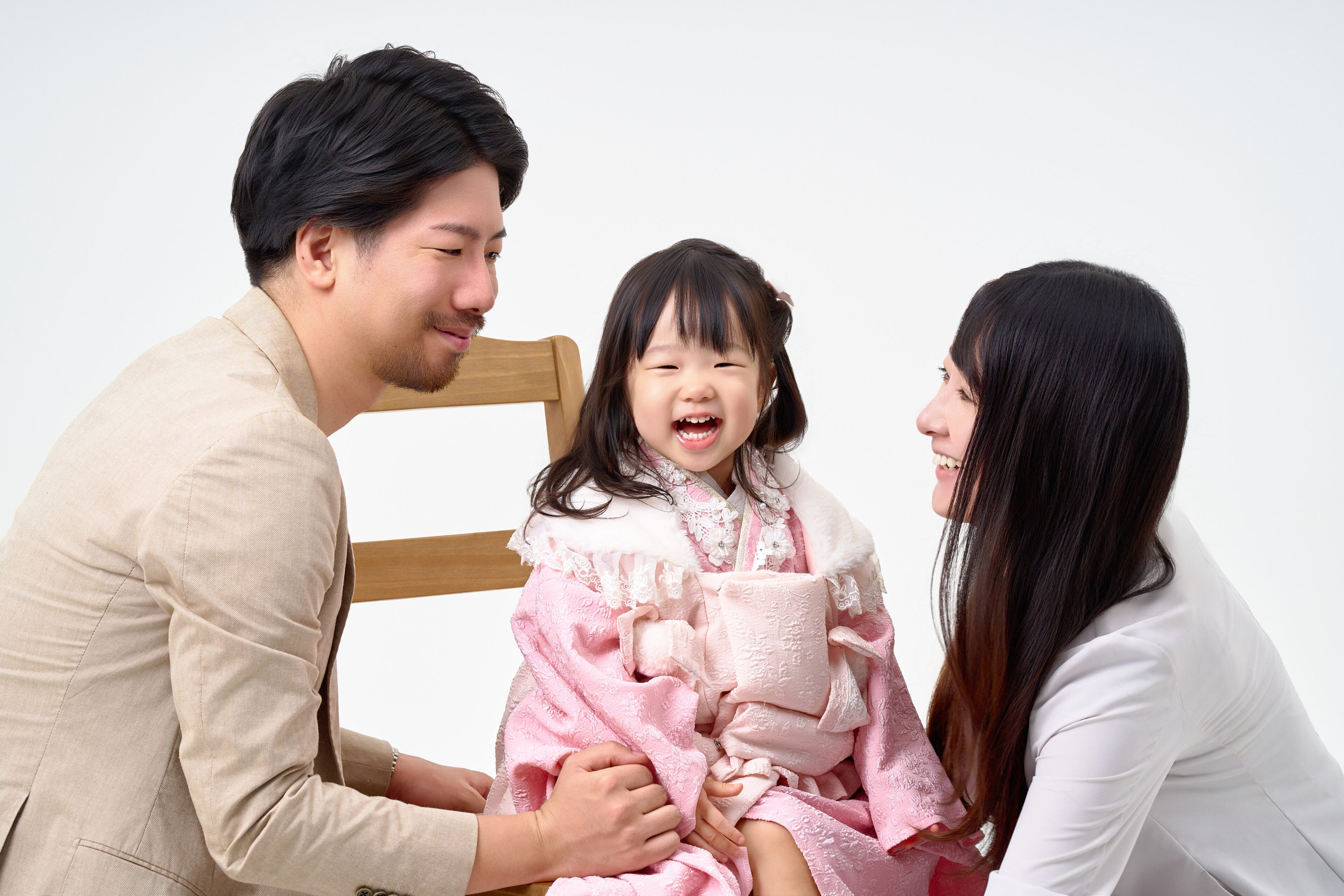 家族写真の撮影です。白ホリでコントロールしやすいライティングを使い、着物の色をより鮮やかに映えます。ご家族が笑い合う瞬間や視線の交わりを大事に切り取っていきます。晴れの日でも、いつの日でも、成長の喜びを感じる一枚を提供します。