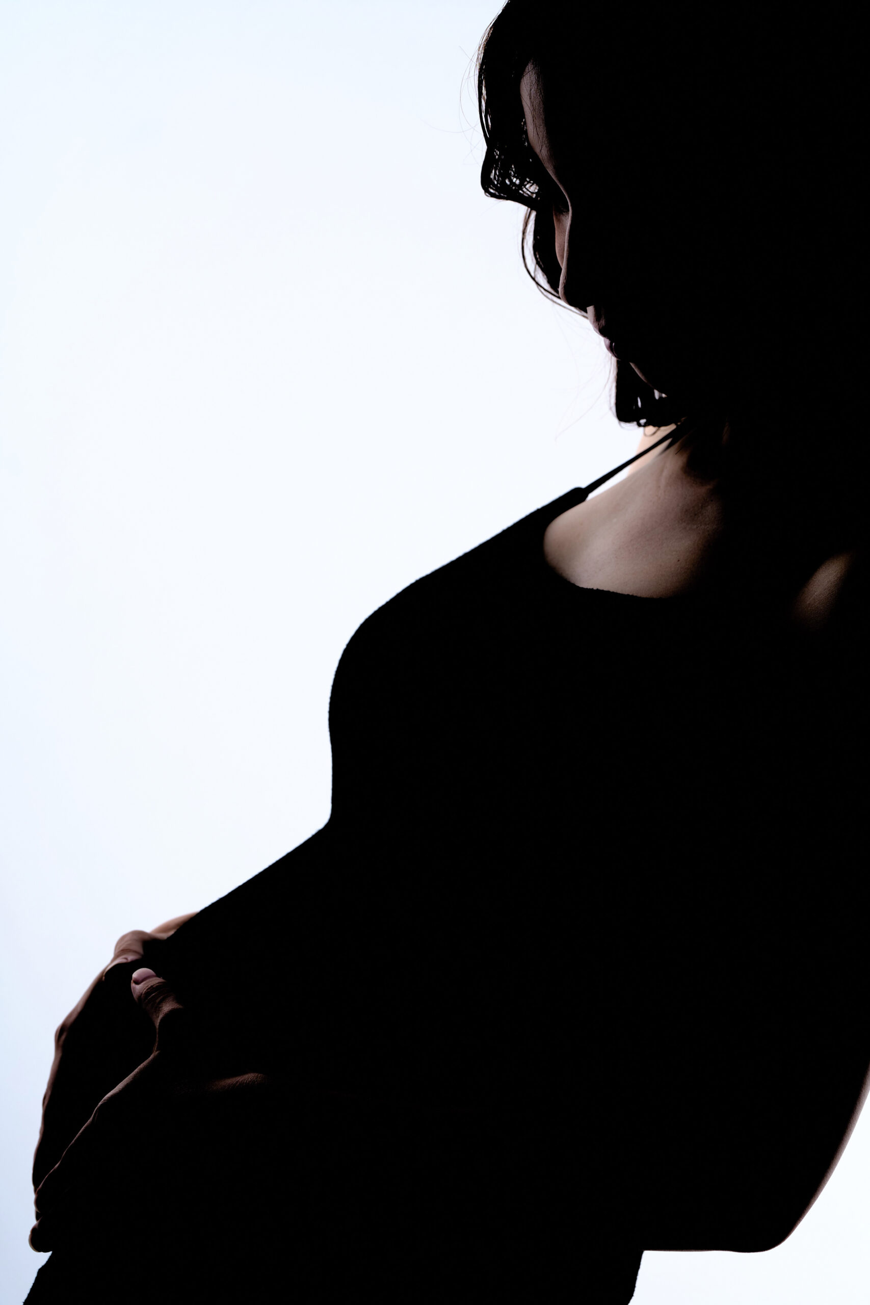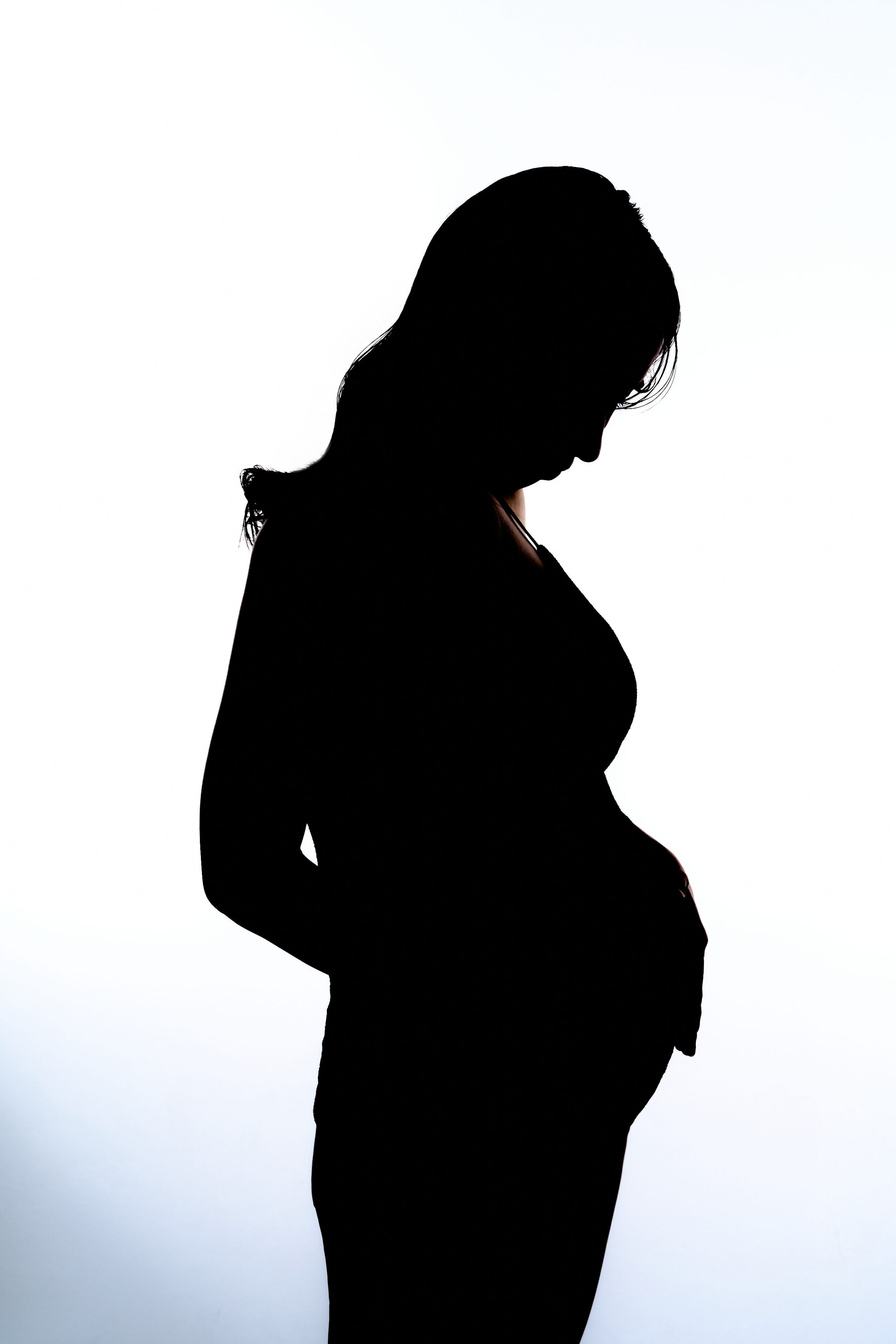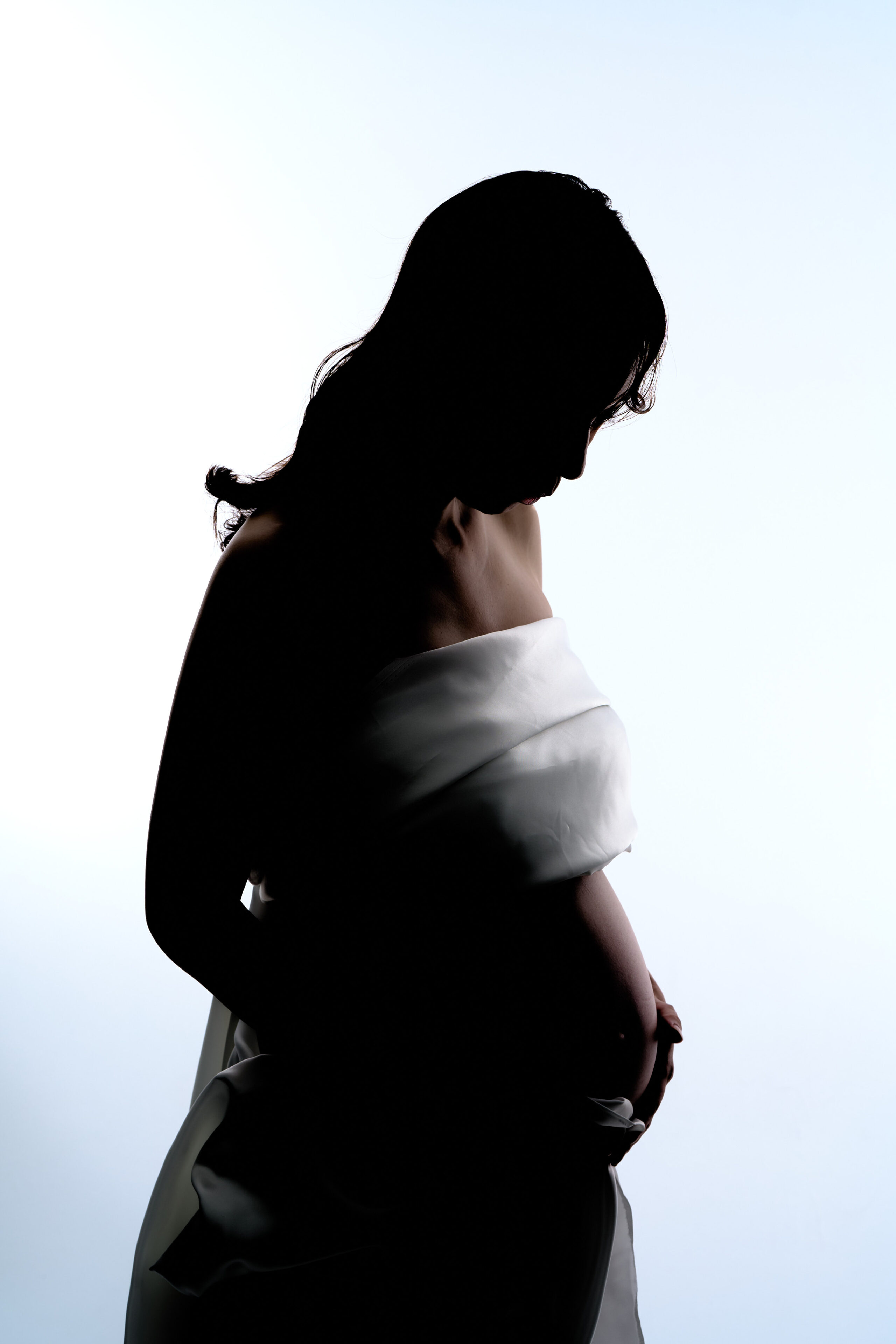 マタニティフォトの撮影です。白背景で光と影のコントラストを活かし、シルエットならではの妊婦さまのお腹のラインや姿勢がを浮かび上がり、神秘的で上品な印象に。