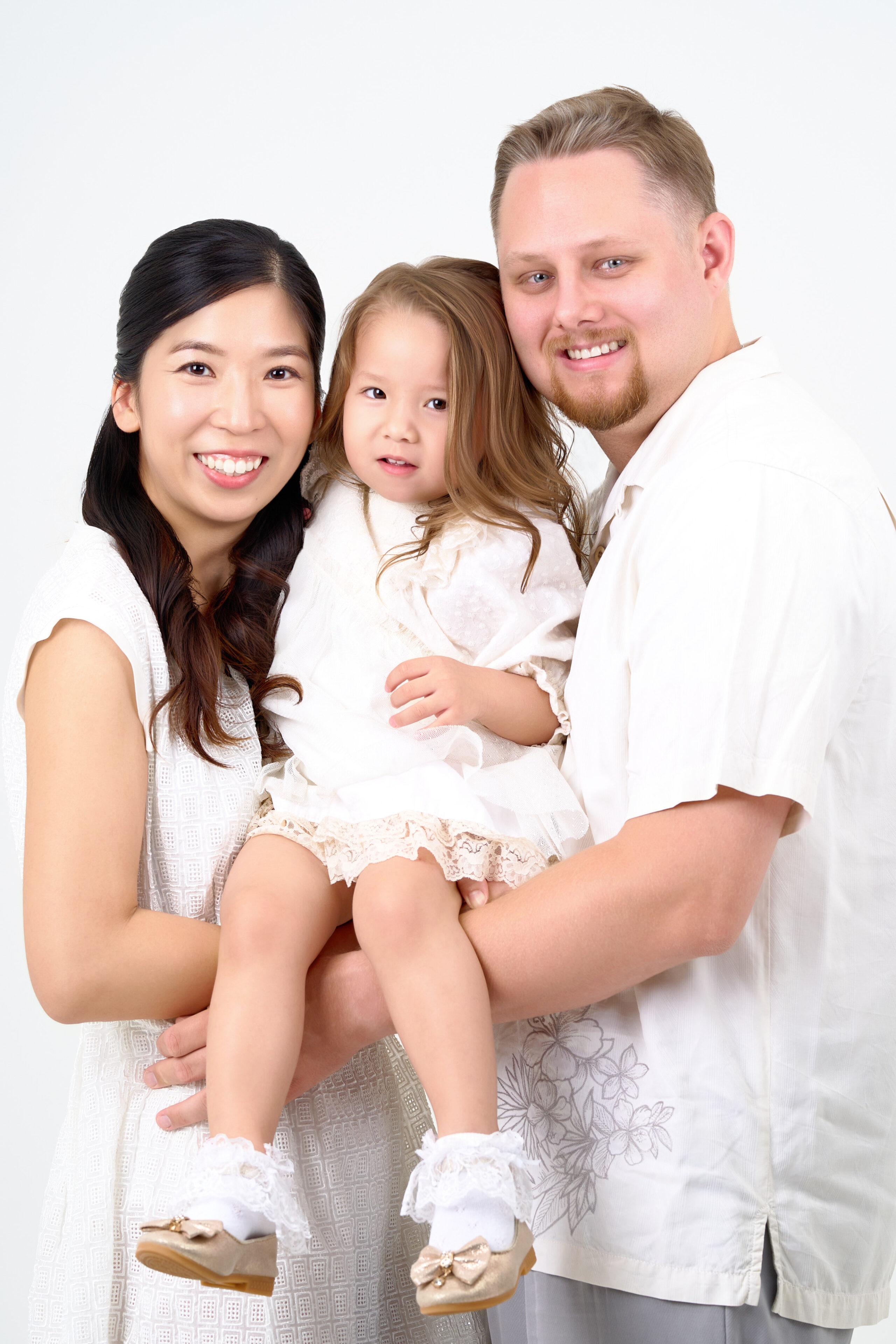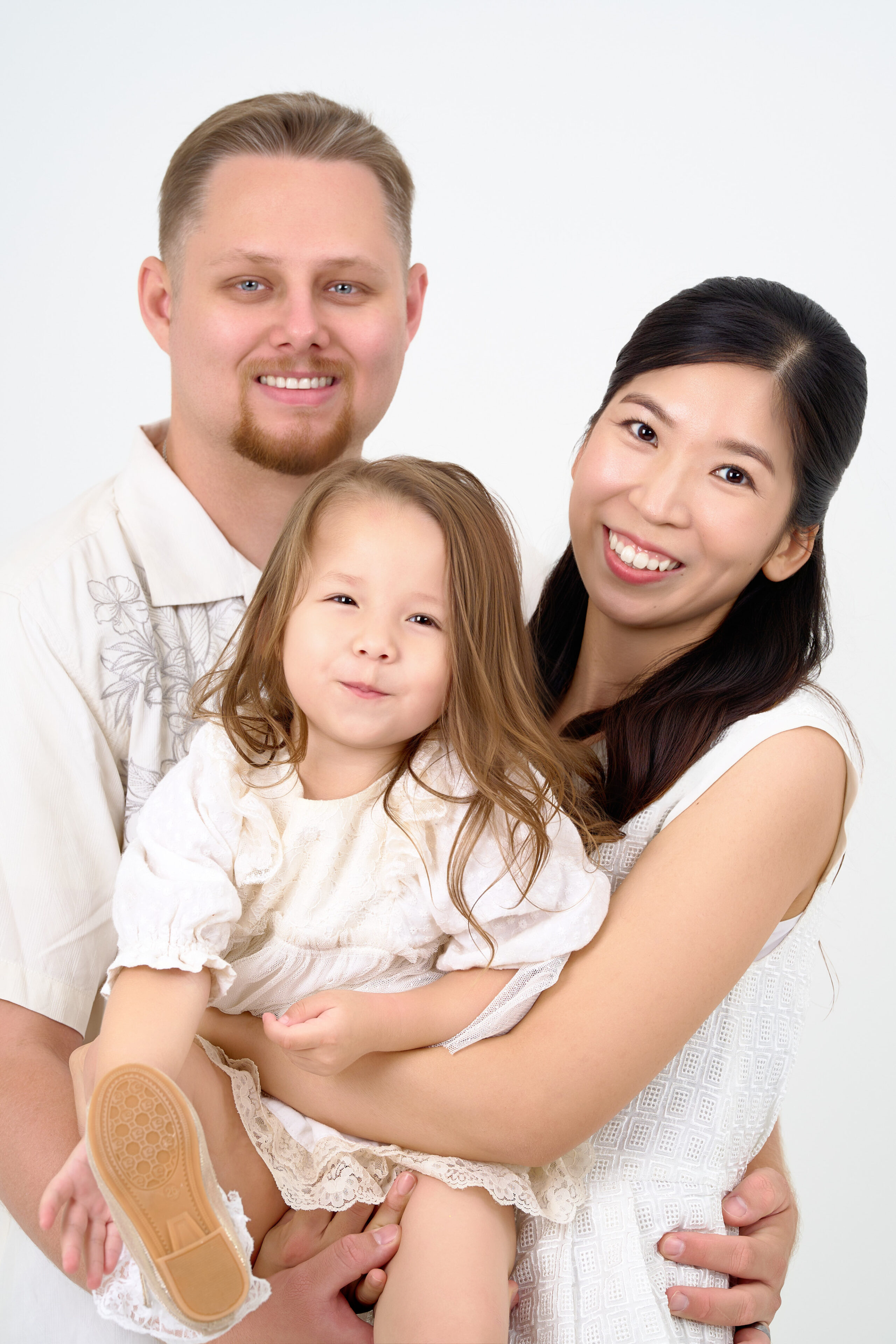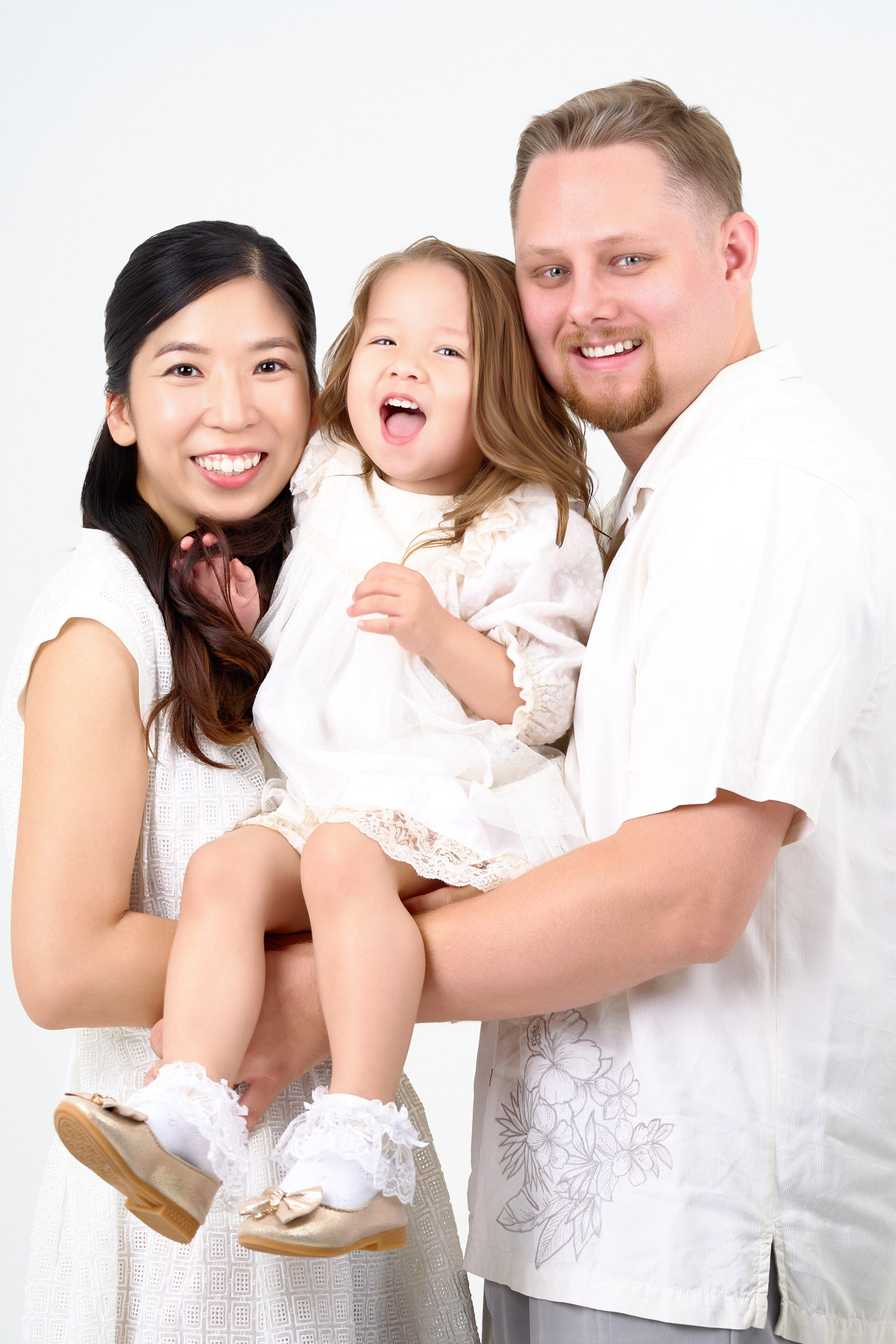 家族写真の撮影です。白ホリでの撮影は、こだわりのライティングを使用し、ご家族全員の笑顔が引き立てます。おそろいの白コーデで、ご家族の「今」を等身大に残します。