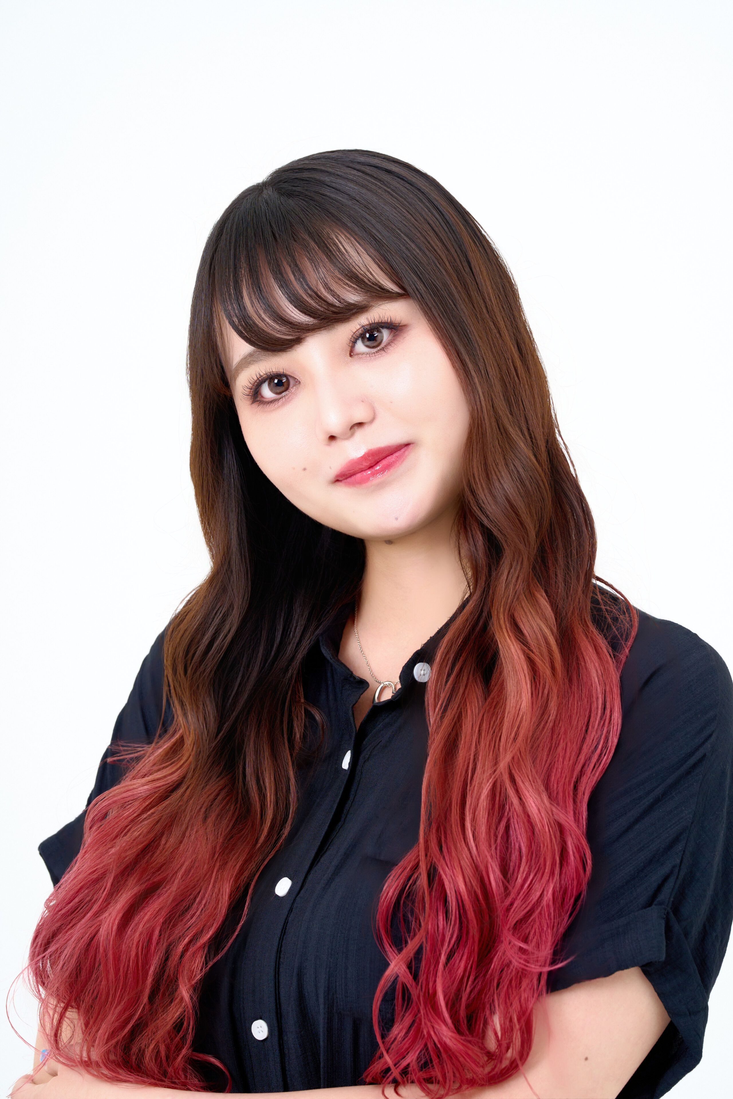 髪色や衣装に合わせて、アイブロウ・チーク・リップはピンク系カラーを使用し、前髪や顔周りの毛にゆるやかな曲線を持たすことで、お顔の印象をより引き立て、ポップで華やかなイメージを引き出しています。