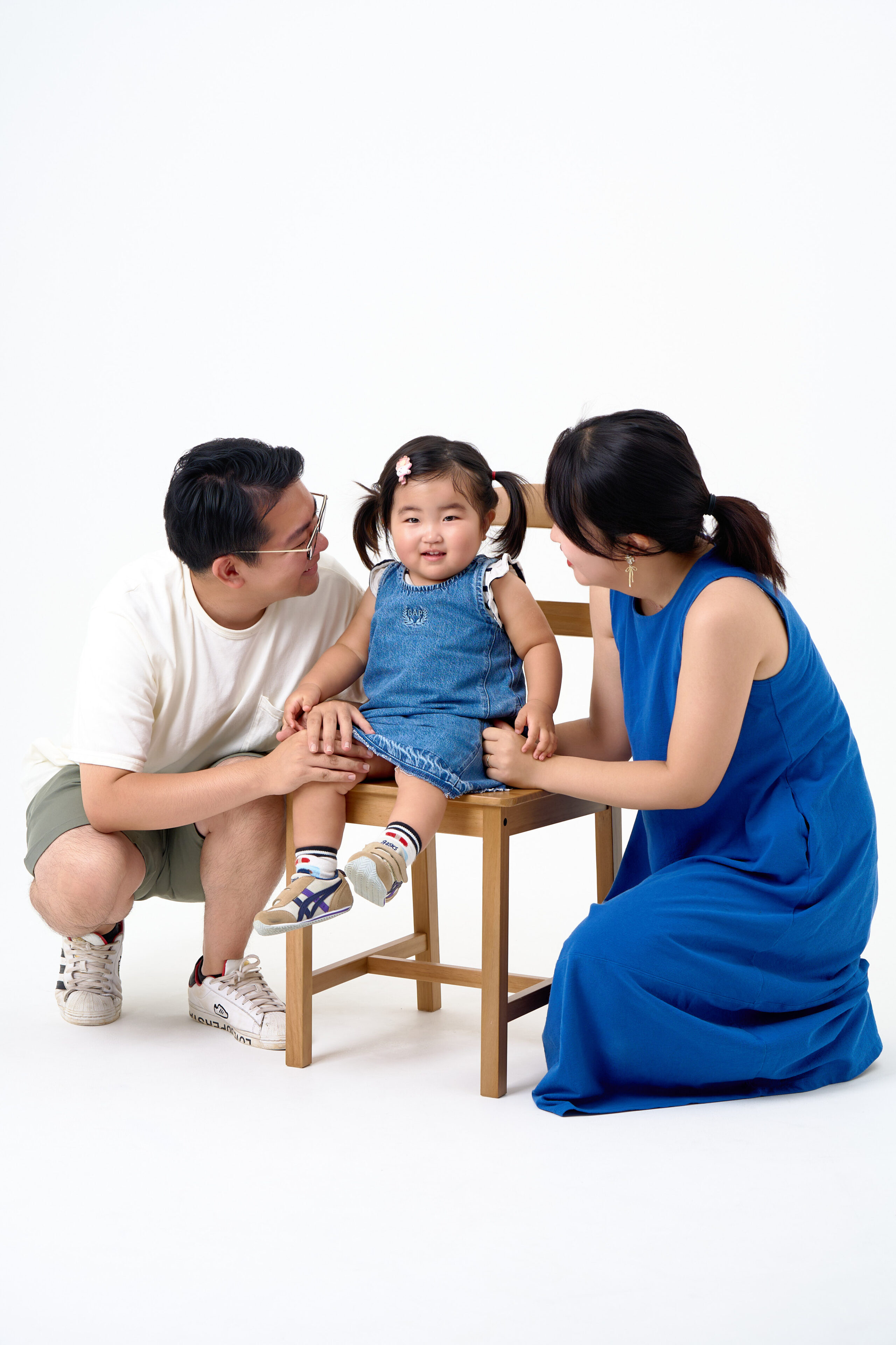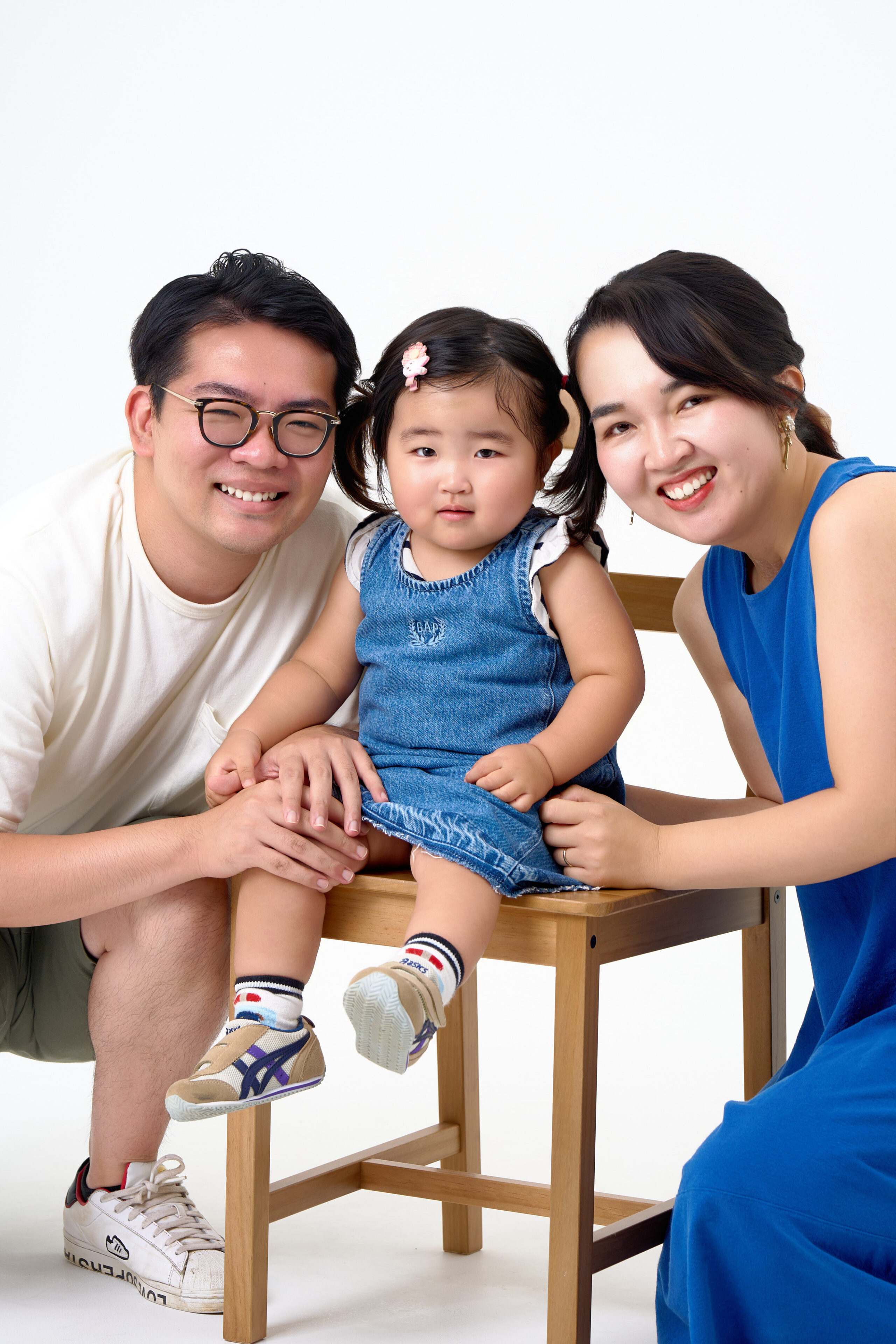 家族写真の撮影です。白背景のシンプルな構成で、明るさが際立つ写真に仕上げています。ご家族が笑い合う瞬間や視線の交わりを大事に切り取っていきます。晴れの日でも、いつの日でも、成長の喜びを感じる一枚を提供します。