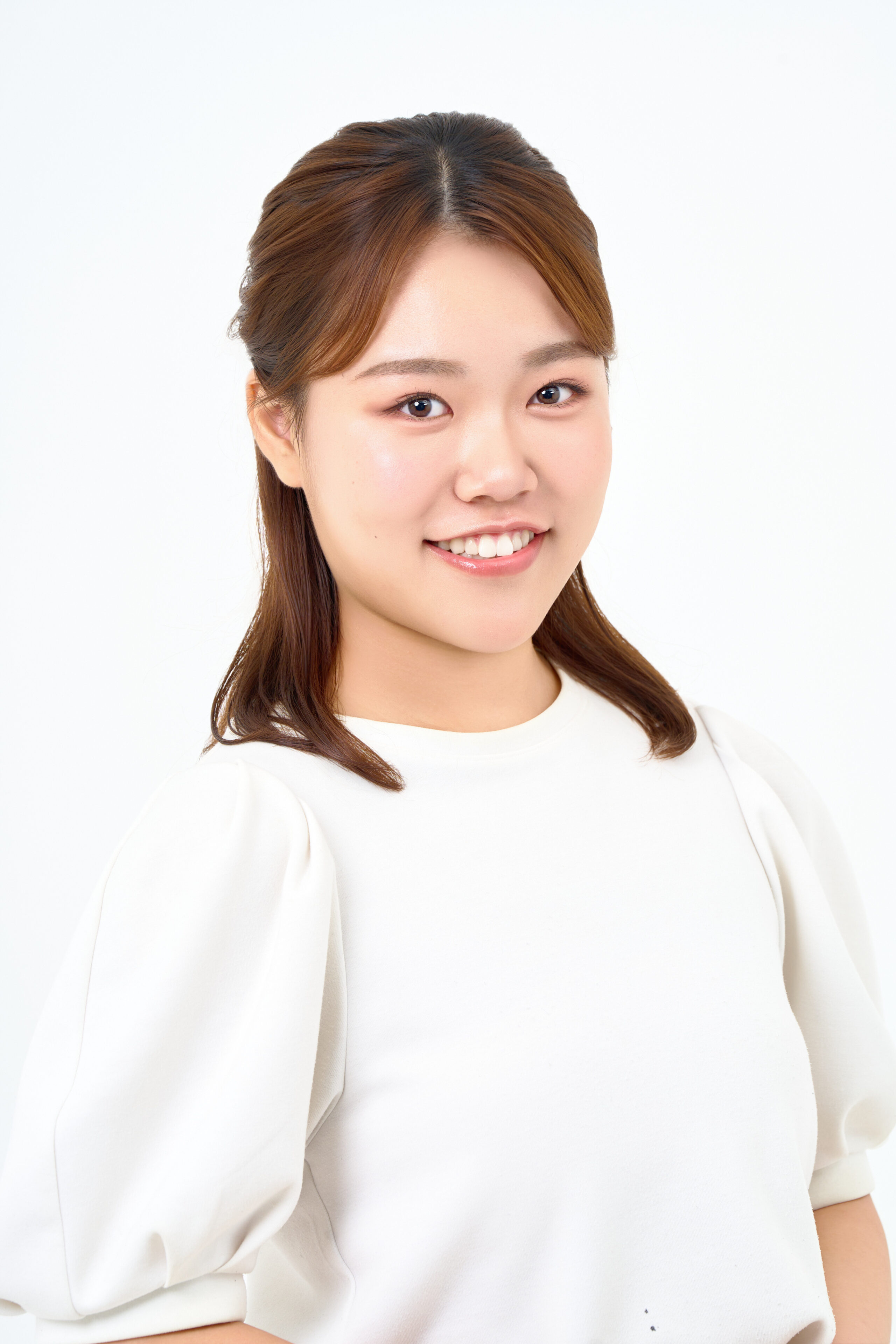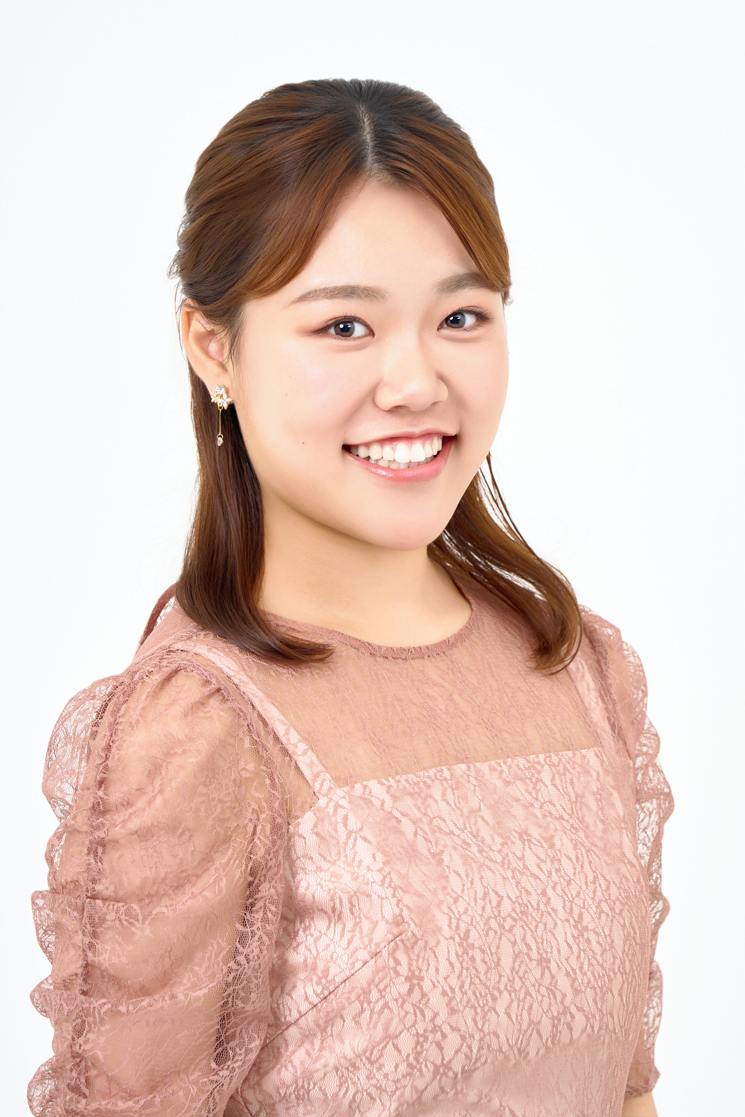 ヘアメイクは肌の色ムラを丁寧に補正し、落ち着いた印象に整えています。ヘアはハーフアップにまとめ、フェイスラインがすっきり見えるよう、華やかさを意識して、調整しました。