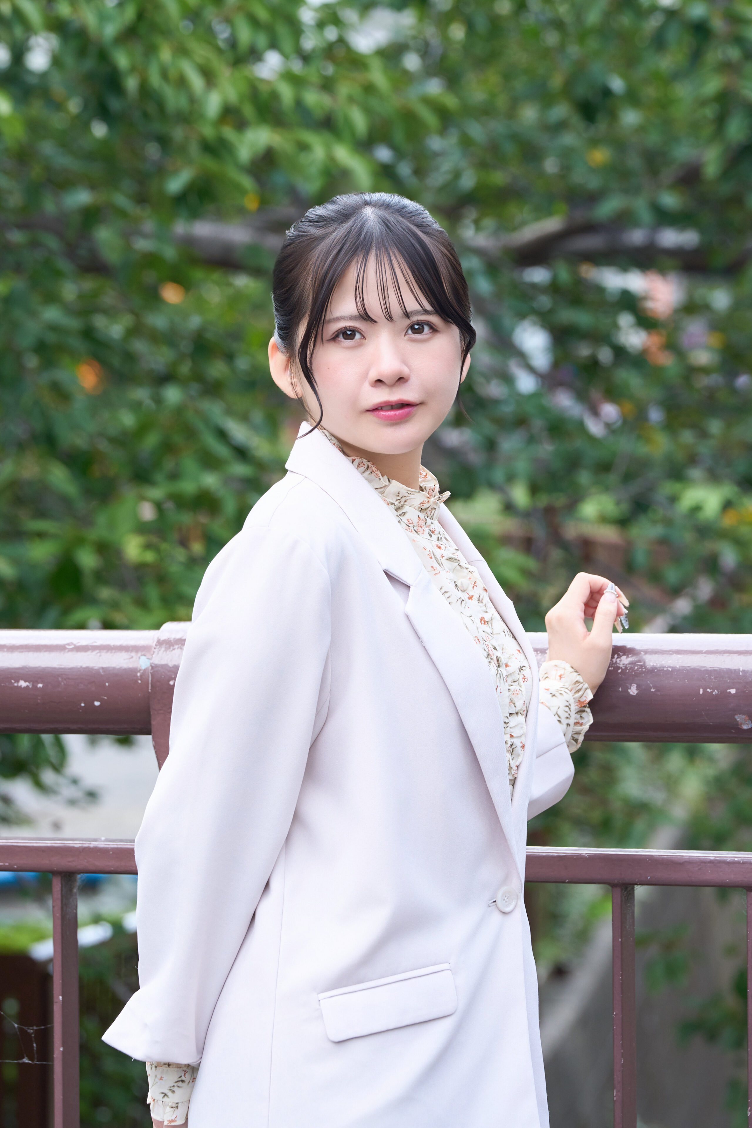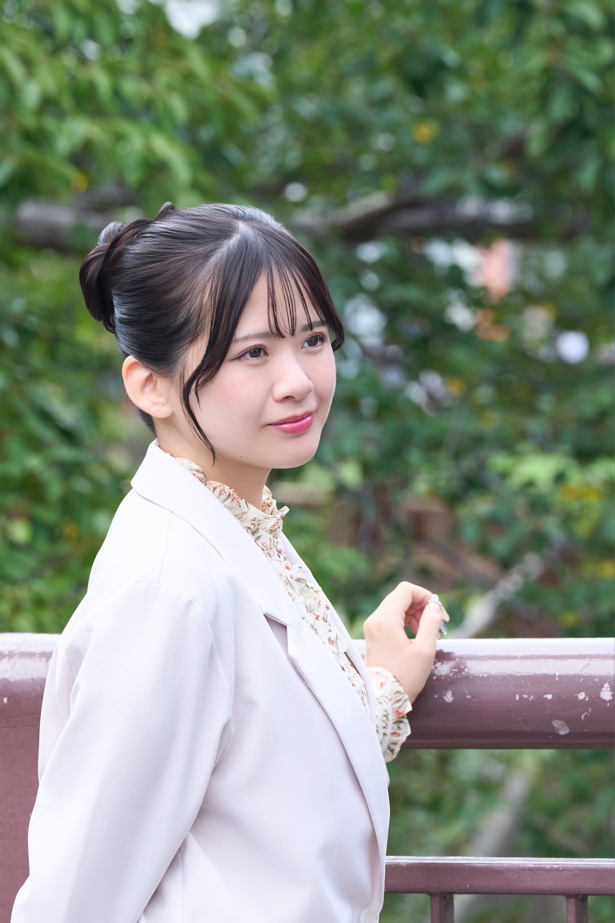 プロフィール写真のロケーション撮影です。緑あふれる川沿いのロケーションが親しみやすさを自然に演出します。背景に柔らかなボケ感が生まれることで、SNSにも使いやすい一枚に。