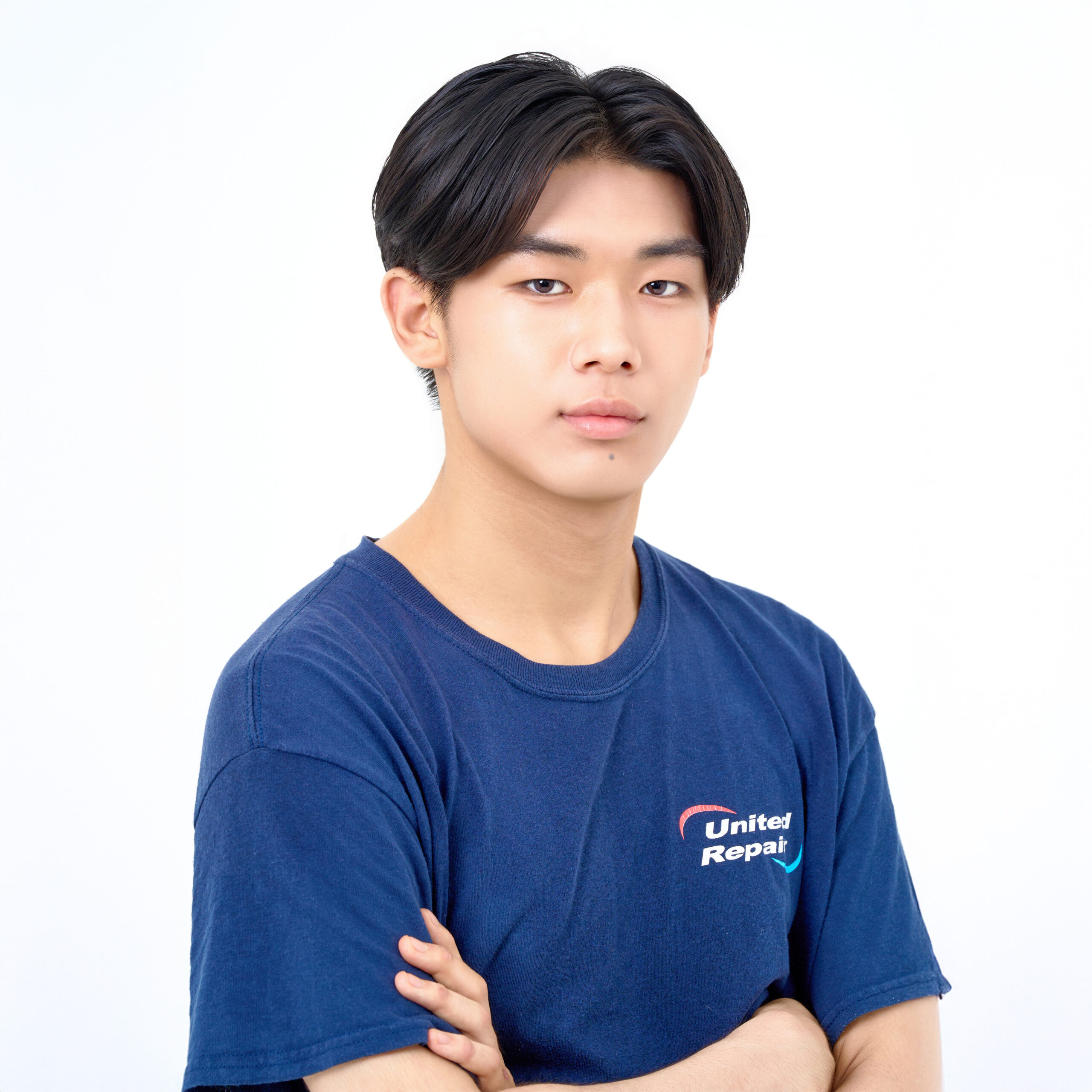 肌のトーンを均一に整えつつ血色感を加え、清潔感のあるメイクに仕上げました。ヘアスタイルは凛とした目もとのコントラストのスタイリッシュさを活かし、爽やかな雰囲気に仕上げました。