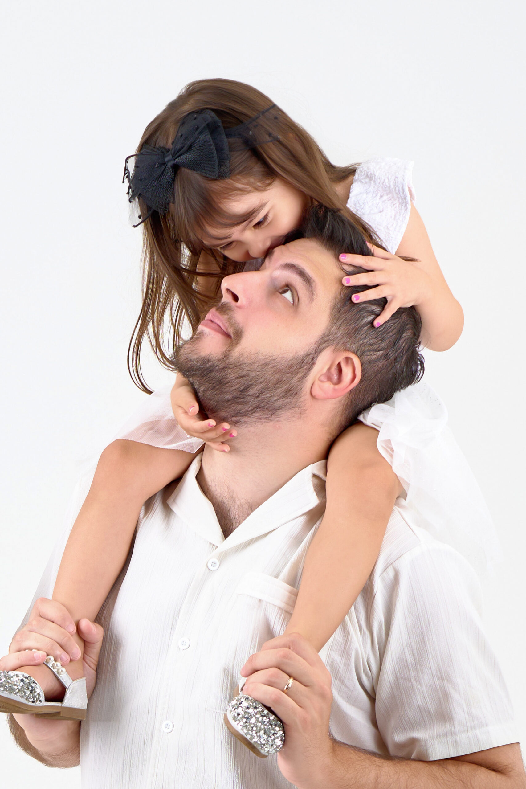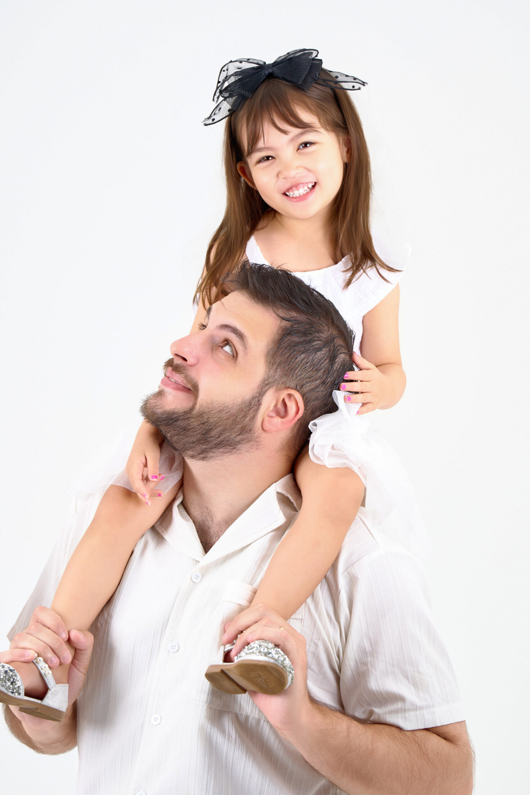 家族写真の撮影です。白背景とこだわりの柔らかいライティングにおそろいの白コーデで、ご家族の表情やしぐさを引き立て、シンプルで洗練された印象に。ポーズを決めず、ご家族が遊んでいる中の自然な瞬間を切り取って、見るたびに心があたたかくなる、等身大の一枚をご提供します。
