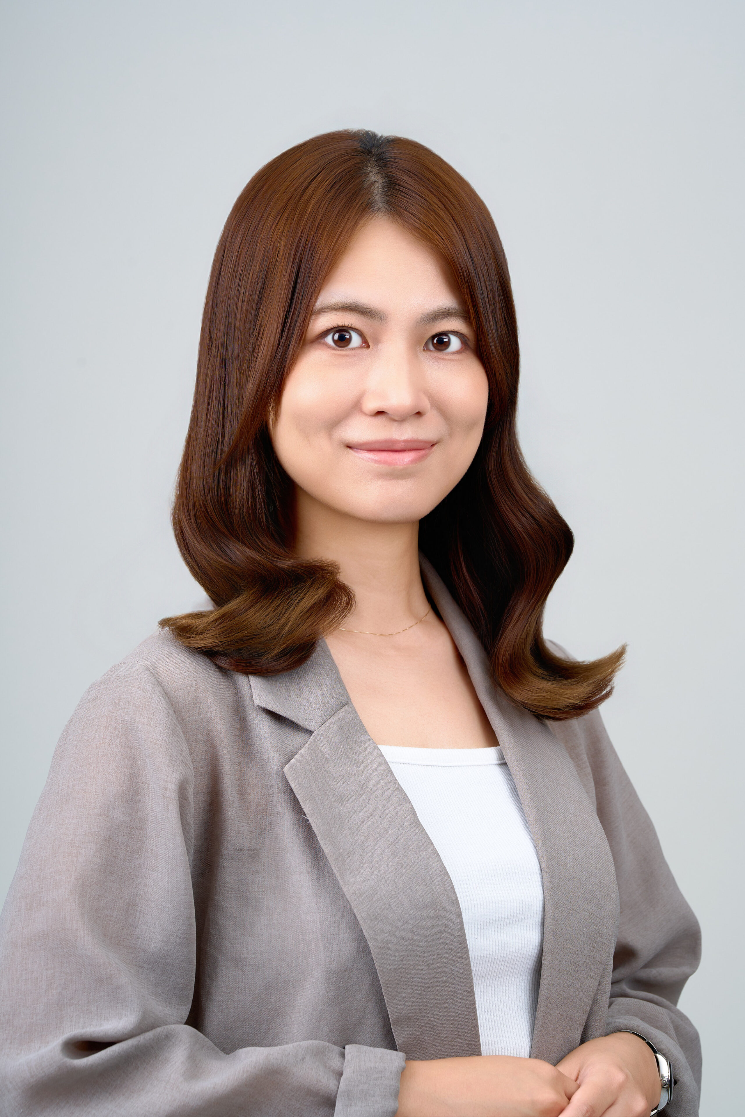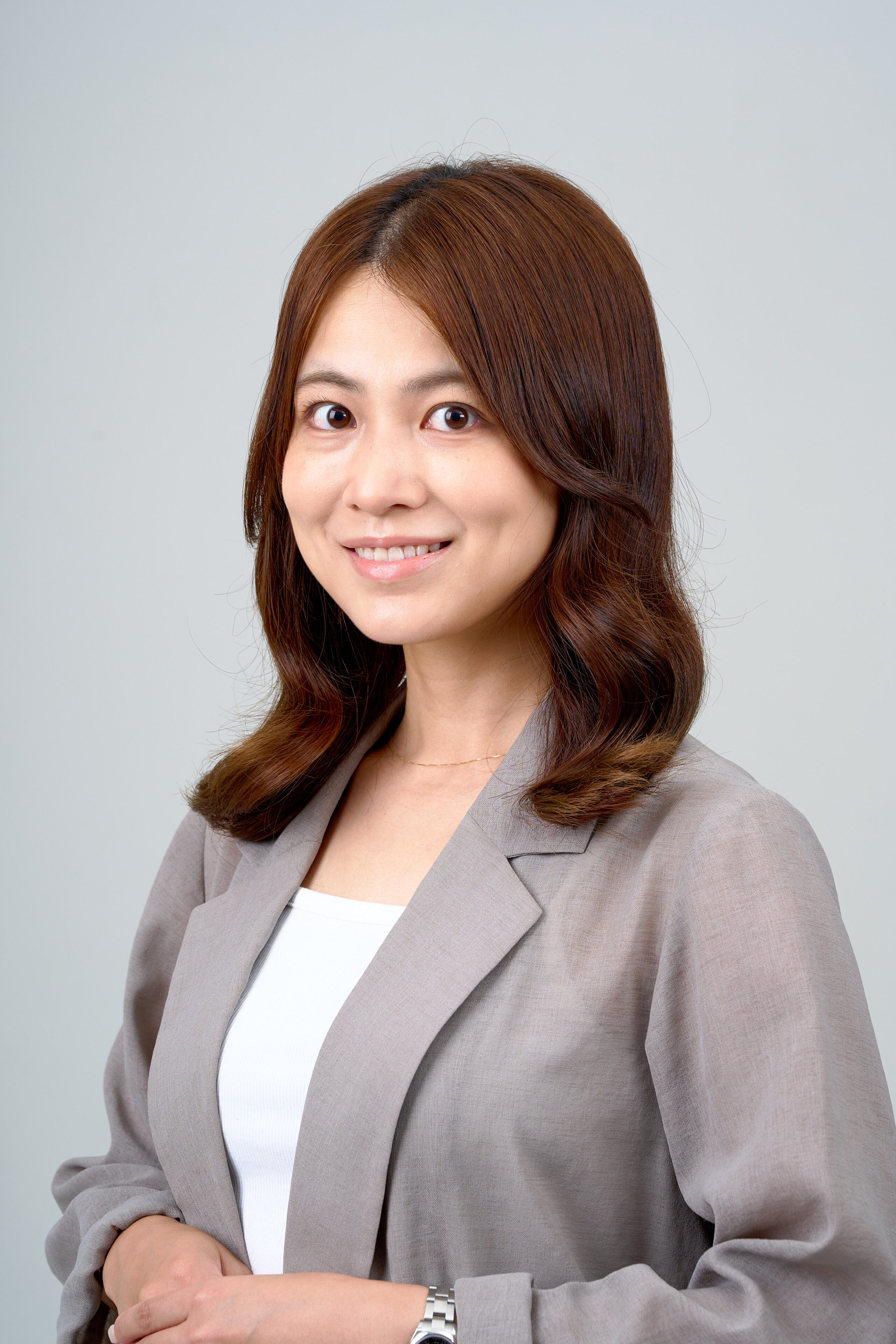 明るいトーンの肌に、ブラウン系のメイクを施し、ぱっと目を引く華やかな印象に仕上げました。大人っぽい雰囲気に合わせ、ヘアスタイルは巻きました。清潔感とスマートさを兼ね備えたスタイルです。