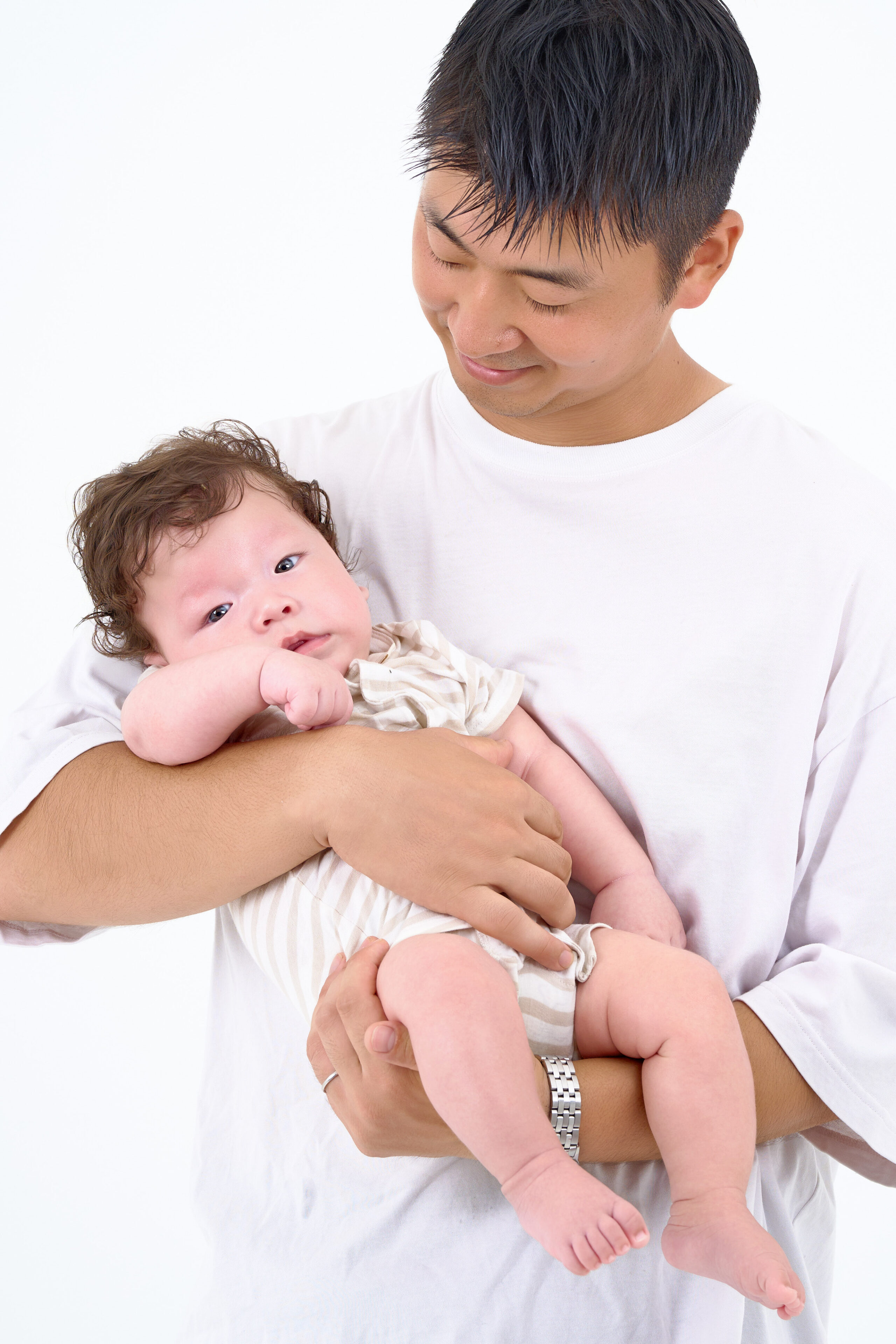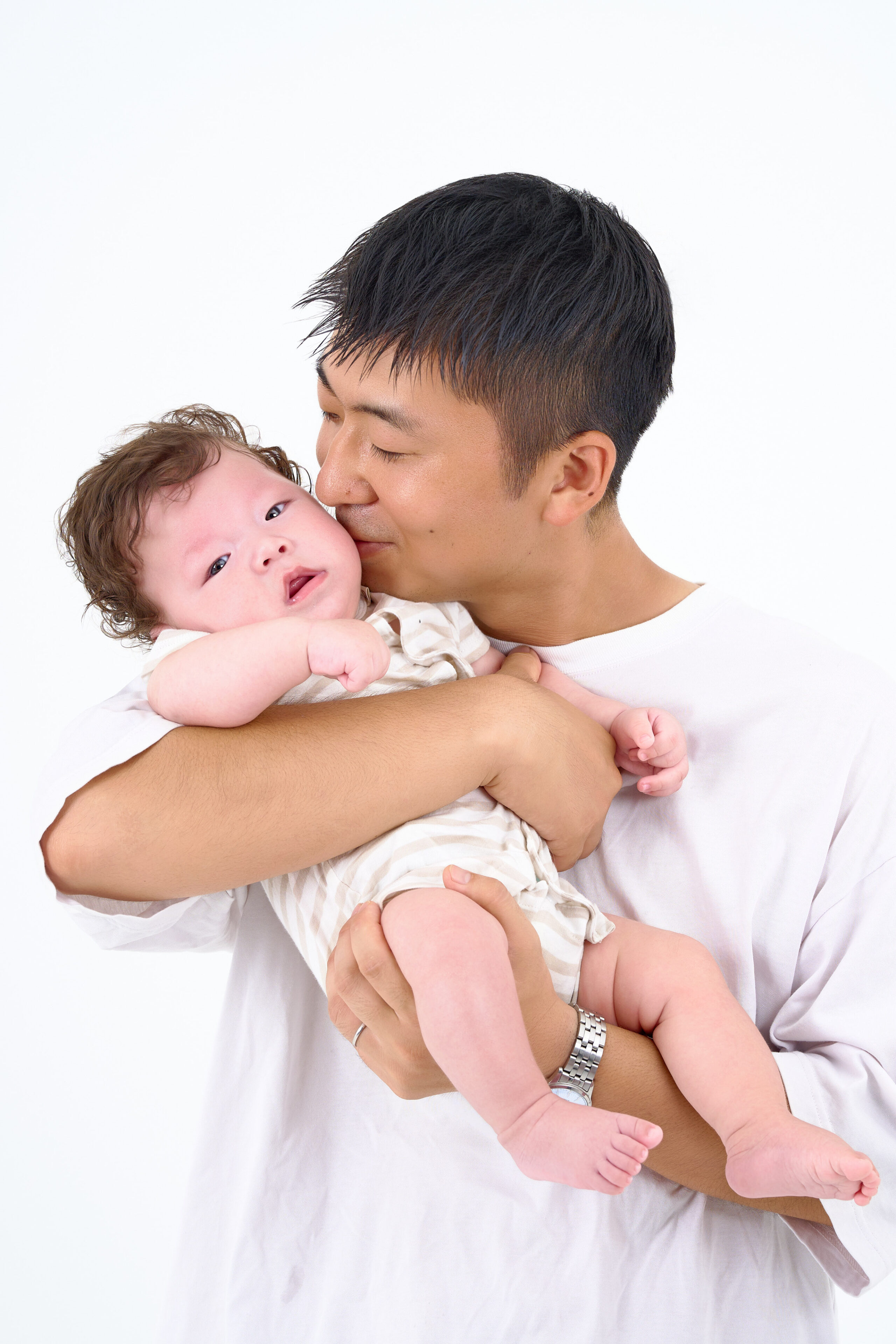 家族写真の撮影です。柔らかいライティングでお父様の優しい表情がしっかり伝わります。ご家族の自然体な雰囲気をプロのカメラマンが引き出していきます。ポージングや立ち位置も丁寧にアドバイスしますので、初めての方、小さいお子様でも安心です。