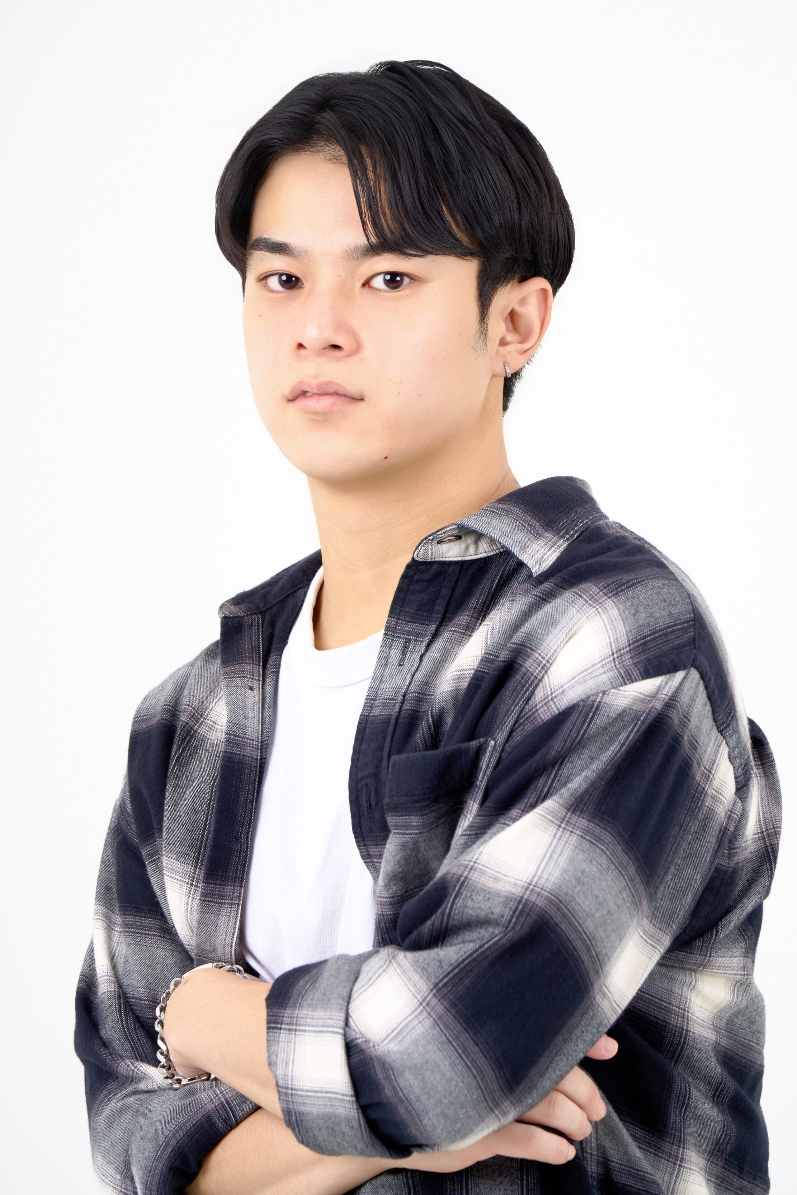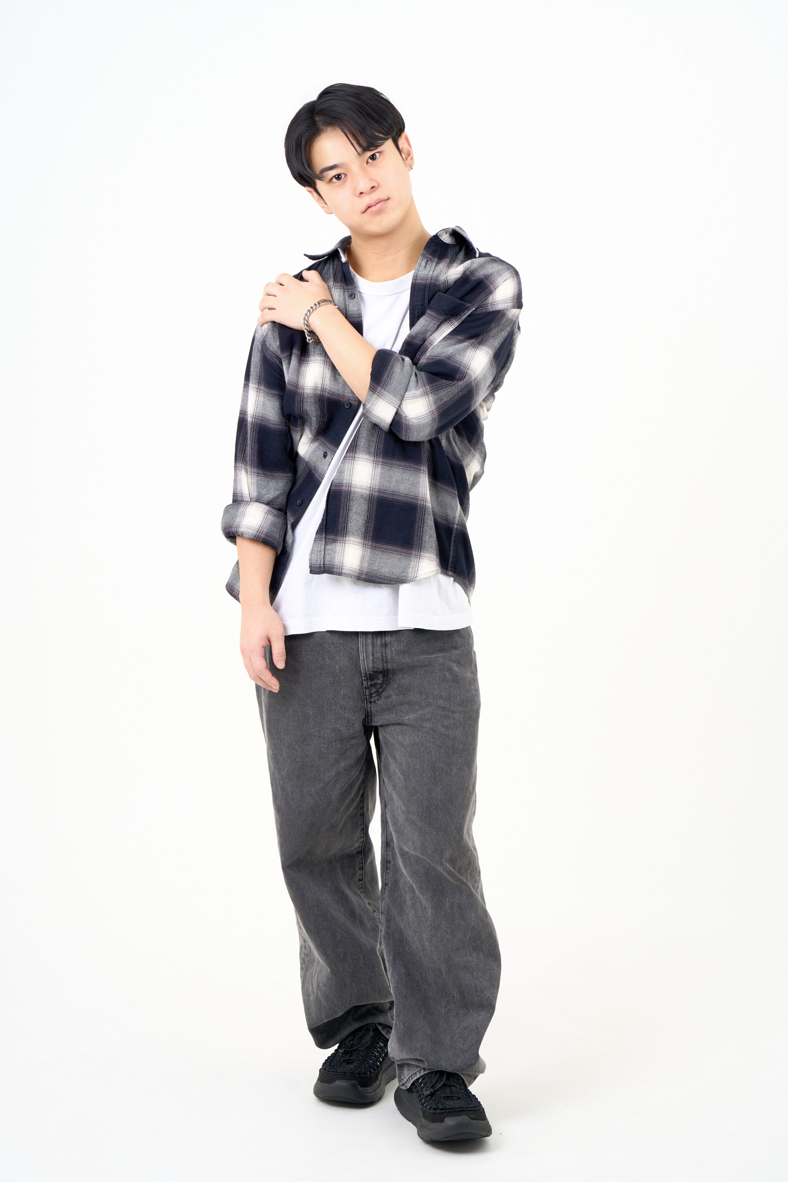 ヘアスタイルは前髪を立ち上げて男らしさを作り出し、印象的な目もとを強調しました。