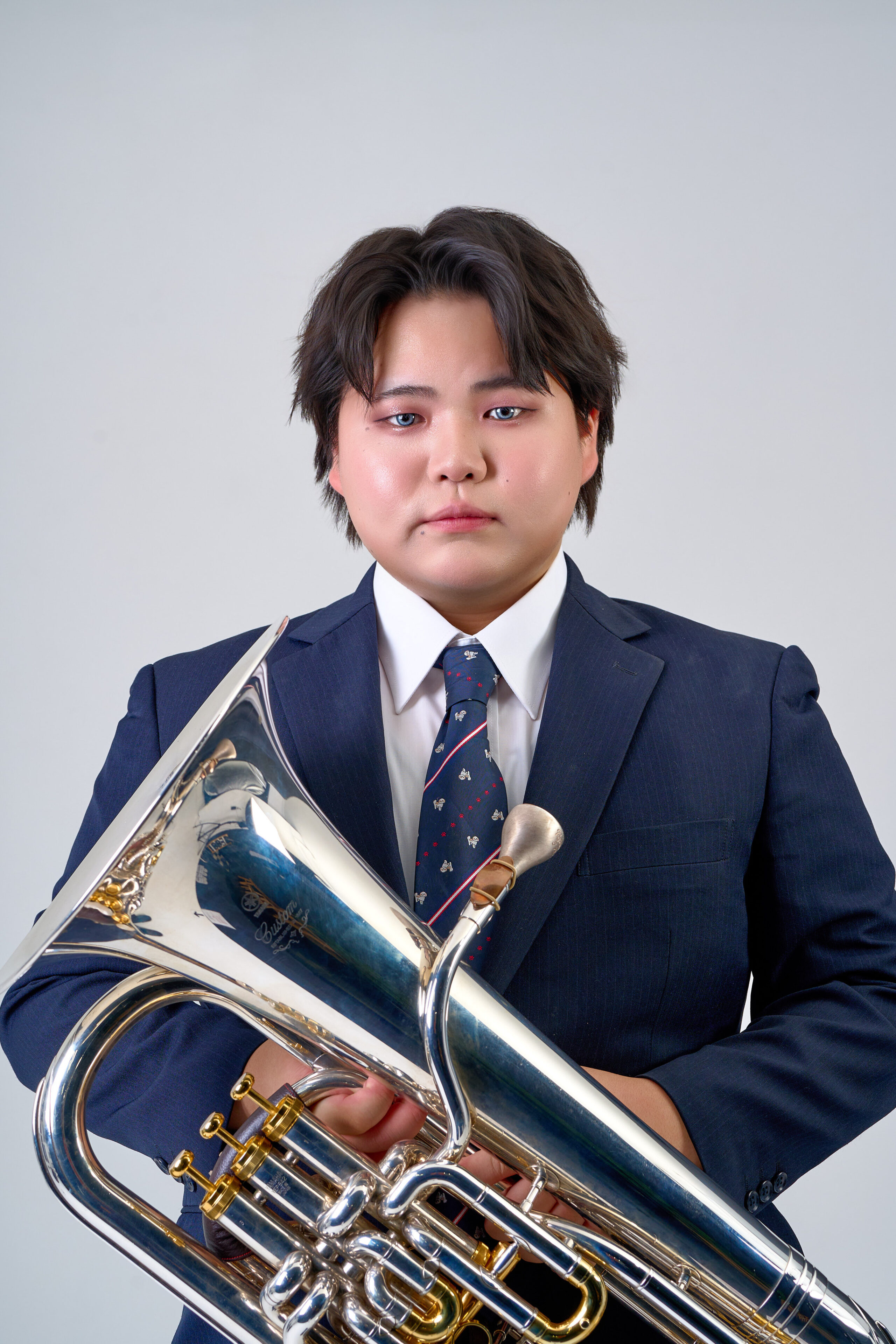 宣材写真の撮影です。グレー調の背景とリッチなライティングを施しました。楽器の持ち方や角度にも細部までこだわり、音楽家の魅力を最大限に引き出します。演奏シーンを彷彿とさせる、深みと品格のある印象に仕上げました。
